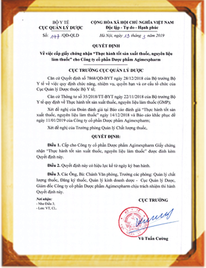 Công ty Cổ phần Dược phẩm Agimexpharm từ khi thành lập cho đến nay, tập thể cán bộ và lãnh đạo của công ty, luôn chú trọng đến việc tạo ra những sản phẩm Dược chất lượng, được người tiêu dùng cả nước tin tưởng và đón nhận. Sau thời gian bình chọn từ người tiêu dùng, đặc biệt là có sự kiểm tra, giám sát của các cơ quan chuyên môn, ngành y tế về các mặt: Chất lượng sản phẩm; môi trường sản xuất; việc sử dụng lao động, bảo vệ quyền lợi người tiêu dùng…đúng theo yêu cầu Bộ y tế đề ra.
