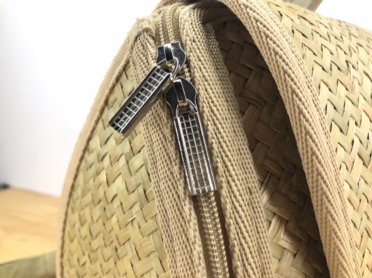 - Lớp bên ngoài được đan chắc chắn bằng cỏ bàng, những đường đan chi tiết tỉ mỉ, được làm thủ công bởi các nghệ nhân là người dân địa phương. Vì lớp ngoài là lớp cỏ khô nên nó rắn chắc, đàn hồi tốt, được thiết kế để làm bộ khung cho giỏ. Đường chỉ may ngay ngắn, ngăn nắp, đồng đều. Màu chỉ được lựa chọn, hài hoà với tổng thể màu của giỏ, không bị chõi màu. Cho nên, lớp vỏ ngoài của balo được ví như người phụ nữ Việt Nam rắn rỏi, bất khuất.