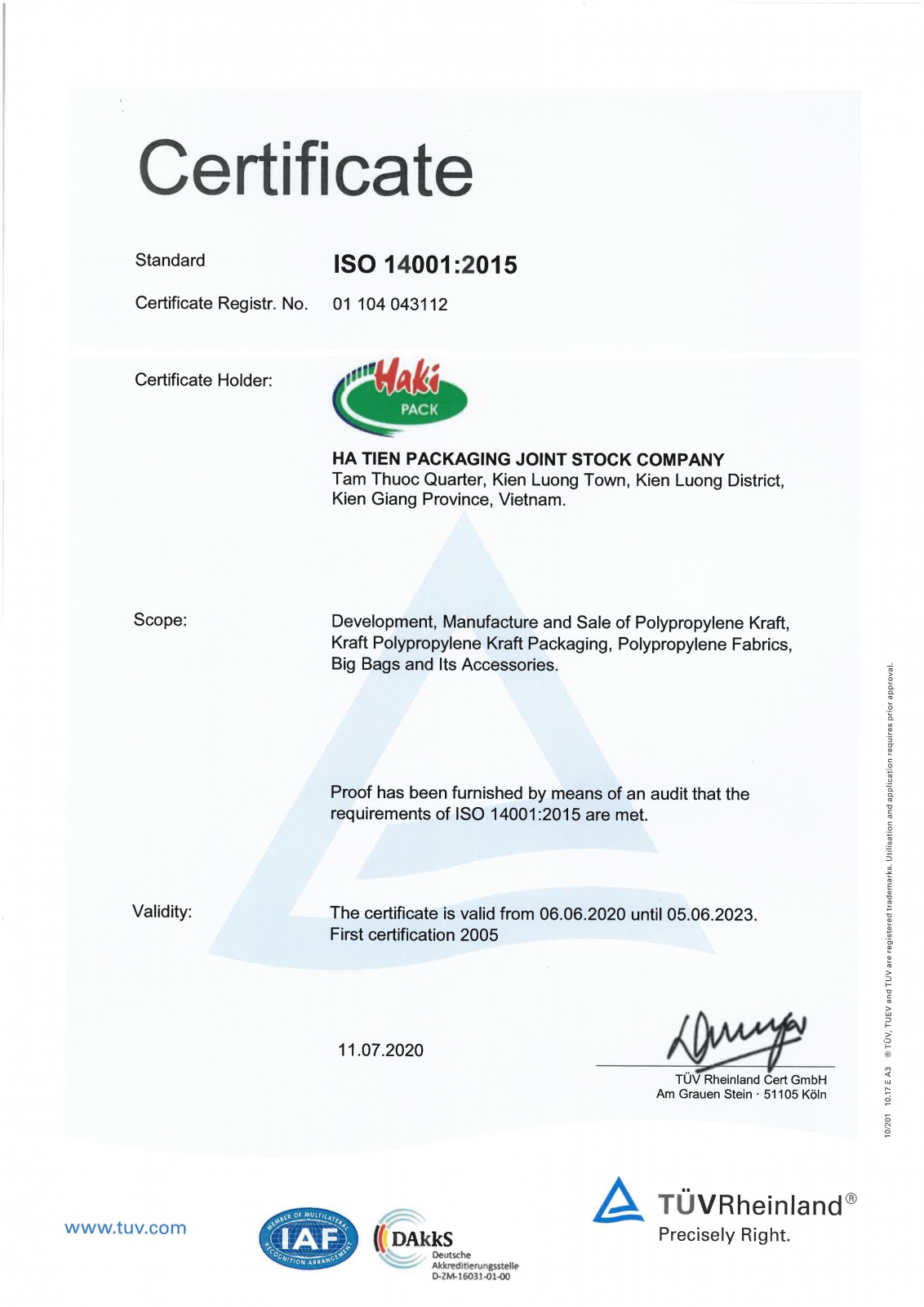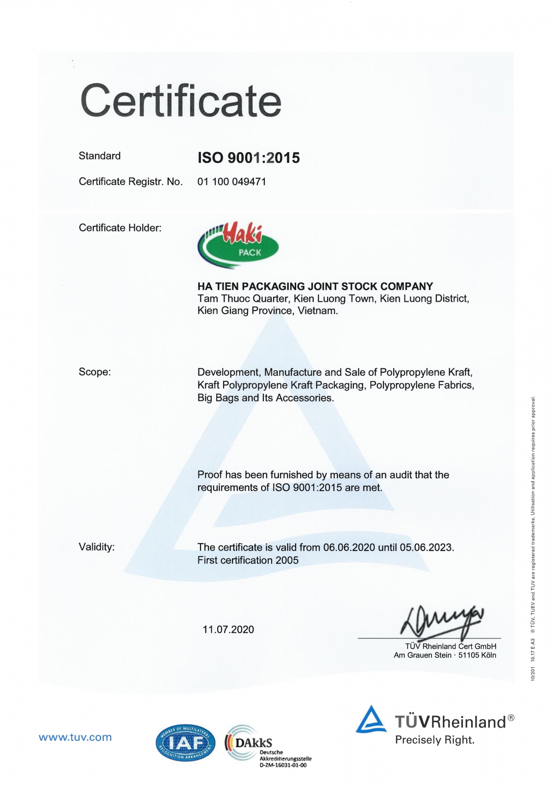 Luôn vấp phải sự cạnh tranh hết sức gay gắt từ các nhà sản xuất cùng loại sản phẩm trong và ngoài nước, sản phẩm cuả Hakipack không những đứng vững mà còn được khách hàng ưa chuộng, hợp tác lâu dài. Thành công này bắt nguồn từ chính sách chất lượng, tôn trọng khách hàng, luôn thực hiện quản lý chất lượng sản phẩm theo ISO 9001 và hệ thống quản lý môi trường ISO 14001được tổ chức TUV Rhemland chứng nhận. Sản phẩm cuả Hakipack đạt tiêu chuẩn Châu Âu, được kiểm tra bởi phòng thí nghiệm Laboratoire national de métrologie et d’esssais cuả Pháp và phòng thí nghiệm Bureau veritas cuả Tây Ban Nha.