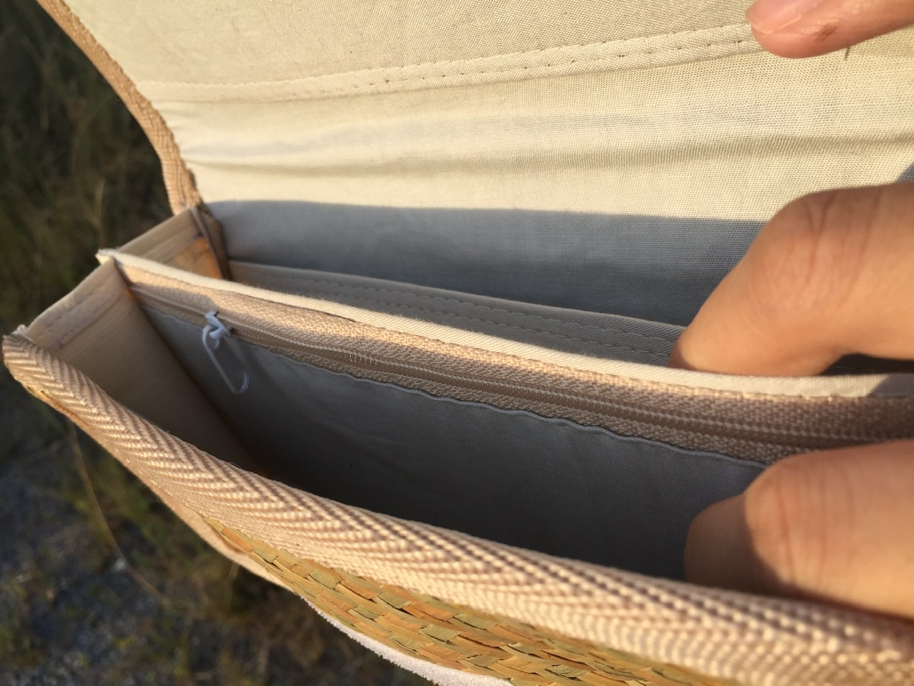 - Lớp ngoài được đan bằng cỏ bàng, với các đường đan tinh tế, tạo nên bộ khung của ví. Lớp viền bằng vải bên ngoài có thể tạo nên cảm giác mềm mại để người dùng để cầm nắm