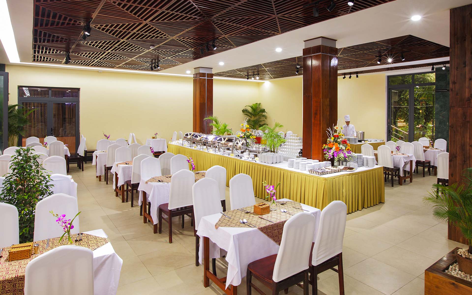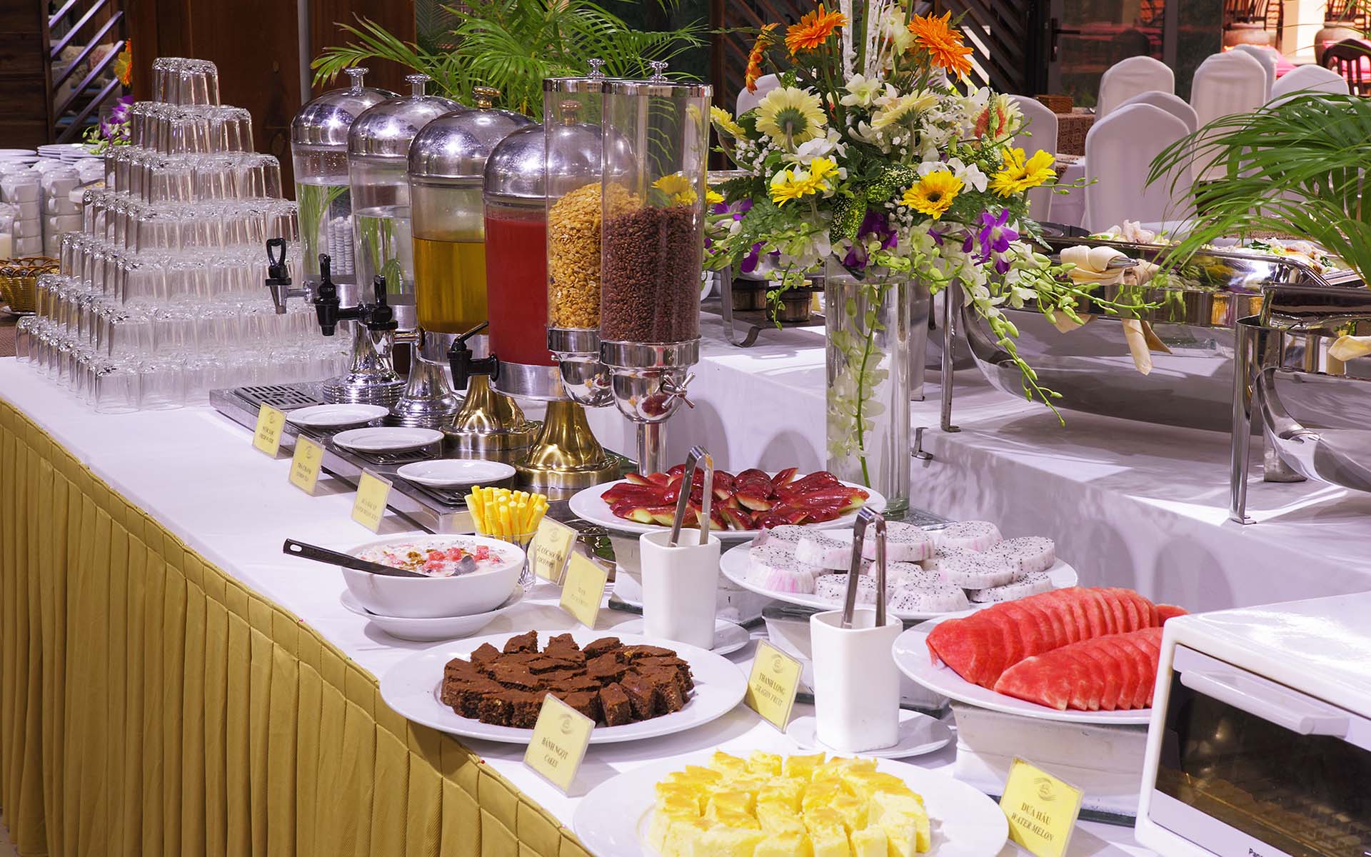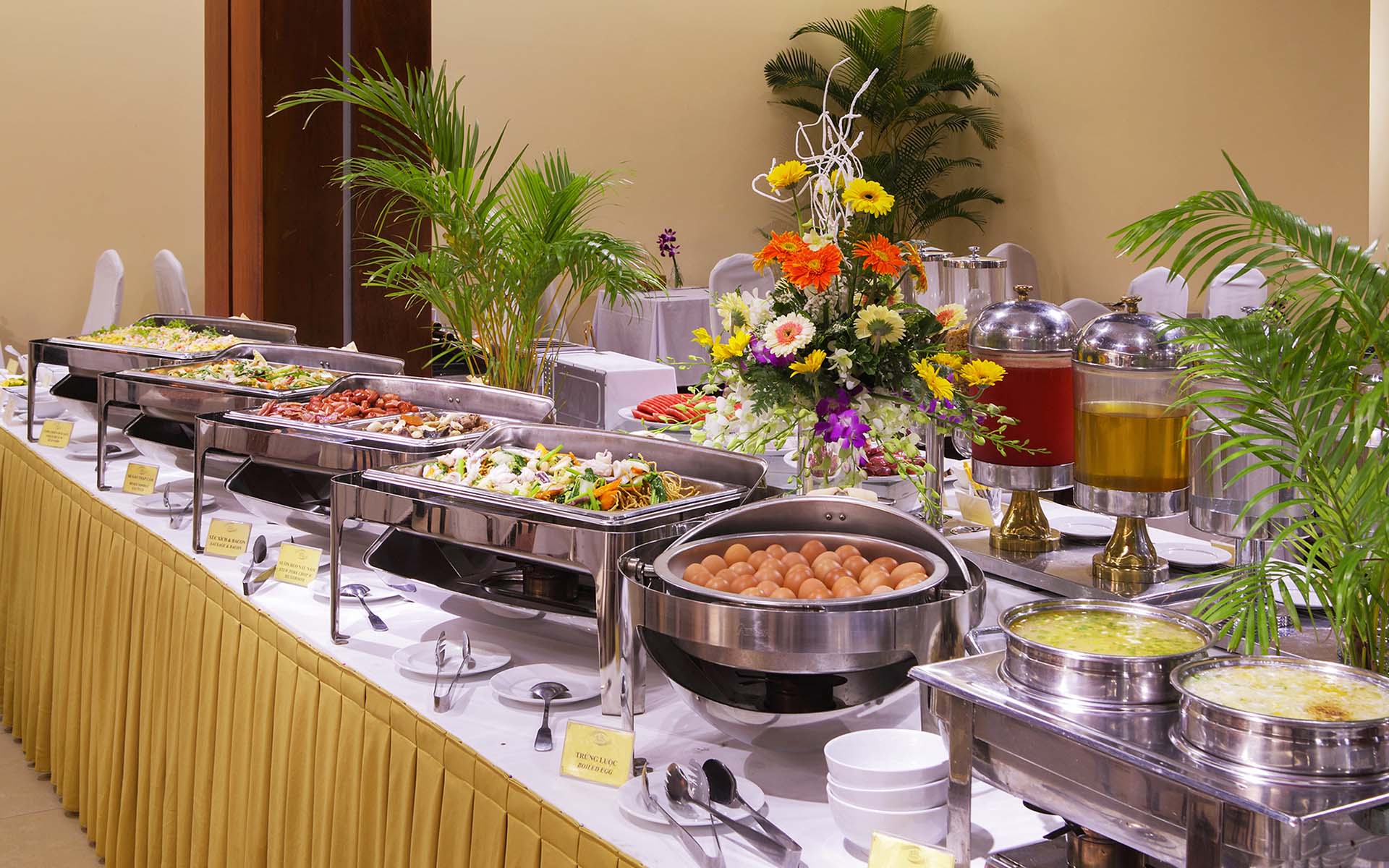 Nhà hàng Buffet Kim Hoa phục vụ điểm tâm sáng cho khách lưu trú trong khung giờ 6h30 - 9h30 hằng ngày. Dưới bàn tay của các đầu bếp chuyên nghiệp sẽ mang đến cho thực khách những món ăn đa dạng, phong phú để bắt đầu một ngày mới đầy năng lượng.Thực đơn được cập nhật thay đổi hằng ngày với số lượng món ăn lên đến 30 món. Với đội ngũ nhân viên dày dặn kinh nghiệm, sẽ mang đến cho các thực khách sự thân thiện, thoải mái khi sử dụng điểm tâm tại nhà hàng chúng tôi.