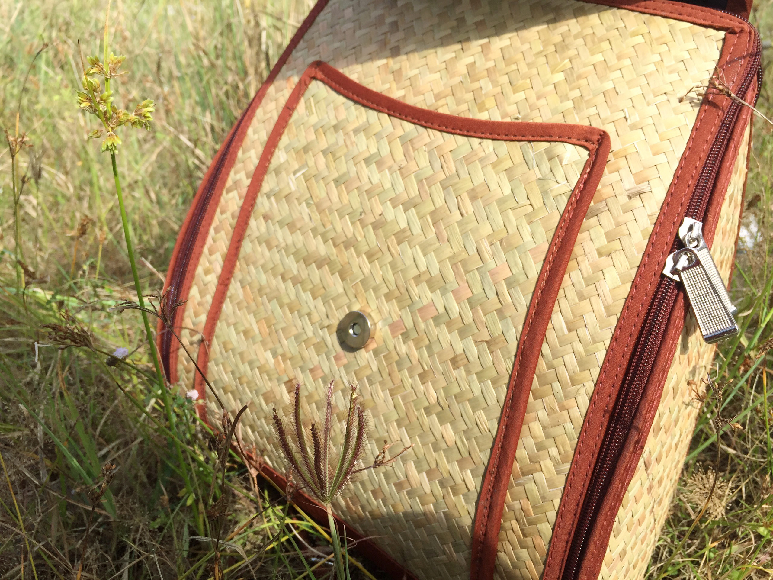 - Lớp bên ngoài được đan chắc chắn bằng cỏ bàng, những đường đan chi tiết tỉ mỉ, được làm thủ công bởi các nghệ nhân là người dân địa phương. Vì lớp ngoài là lớp cỏ khô nên nó rắn chắc, đàn hồi tốt, được thiết kế để làm bộ khung cho giỏ. Đường chỉ may ngay ngắn, ngăn nắp, đồng đều. Màu chỉ được lựa chọn, hài hoà với tổng thể màu của giỏ, không bị chõi màu. Cho nên, lớp vỏ ngoài của balo được ví như người phụ nữ Việt Nam rắn rỏi, bất khuất.