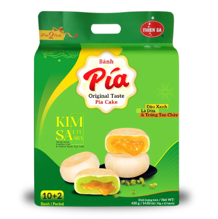 Bánh Pía Kim Sa - Đậu xanh, lá dứa, nhân lòng đỏ trứng muối tan chảy túi 10 bánh tặng thêm 2 bánh (420 gr) là một trong những sản phẩm nổi tiếng của Công ty TNHH MTV Thiên Sa.