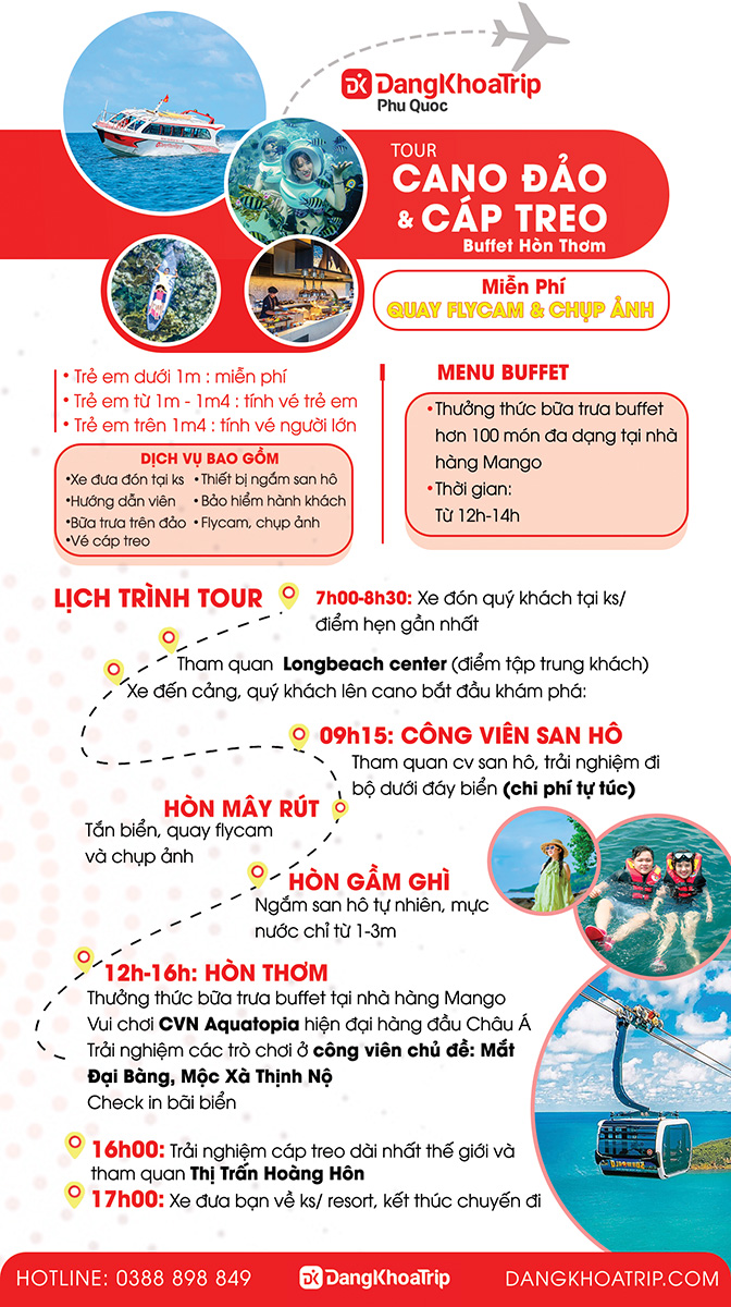 Tour cano đảo cáp treo Hòn Thơm trong ngày của Đăng Khoa Trip sẽ đưa bạn đi tham quan các đảo nhỏ đẹp nhất phía Nam đảo Phú Quốc. Với khung cảnh thiên nhiên vô cùng hoang sơ, gần như giữ được nét tự nhiên vốn có, bạn sẽ được cảm nhận thiên nhiên một cách độc đáo nhất cùng những trải nghiệm thú vị.
