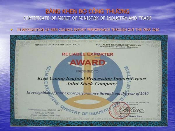 - Năm 2010: Được chủ tịch UBND tỉnh Kiến Giang tặng danh hiệu "Đã có thành tích xuất sắc trong xuất khẩu”.