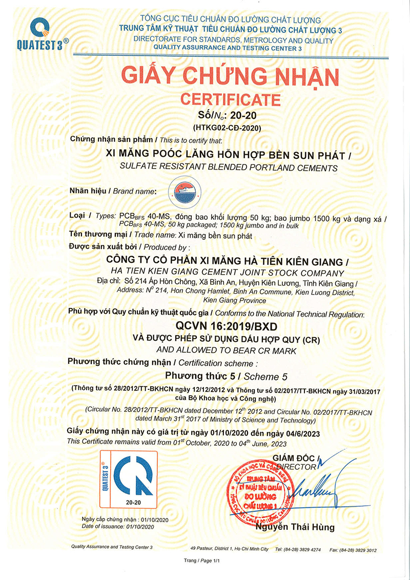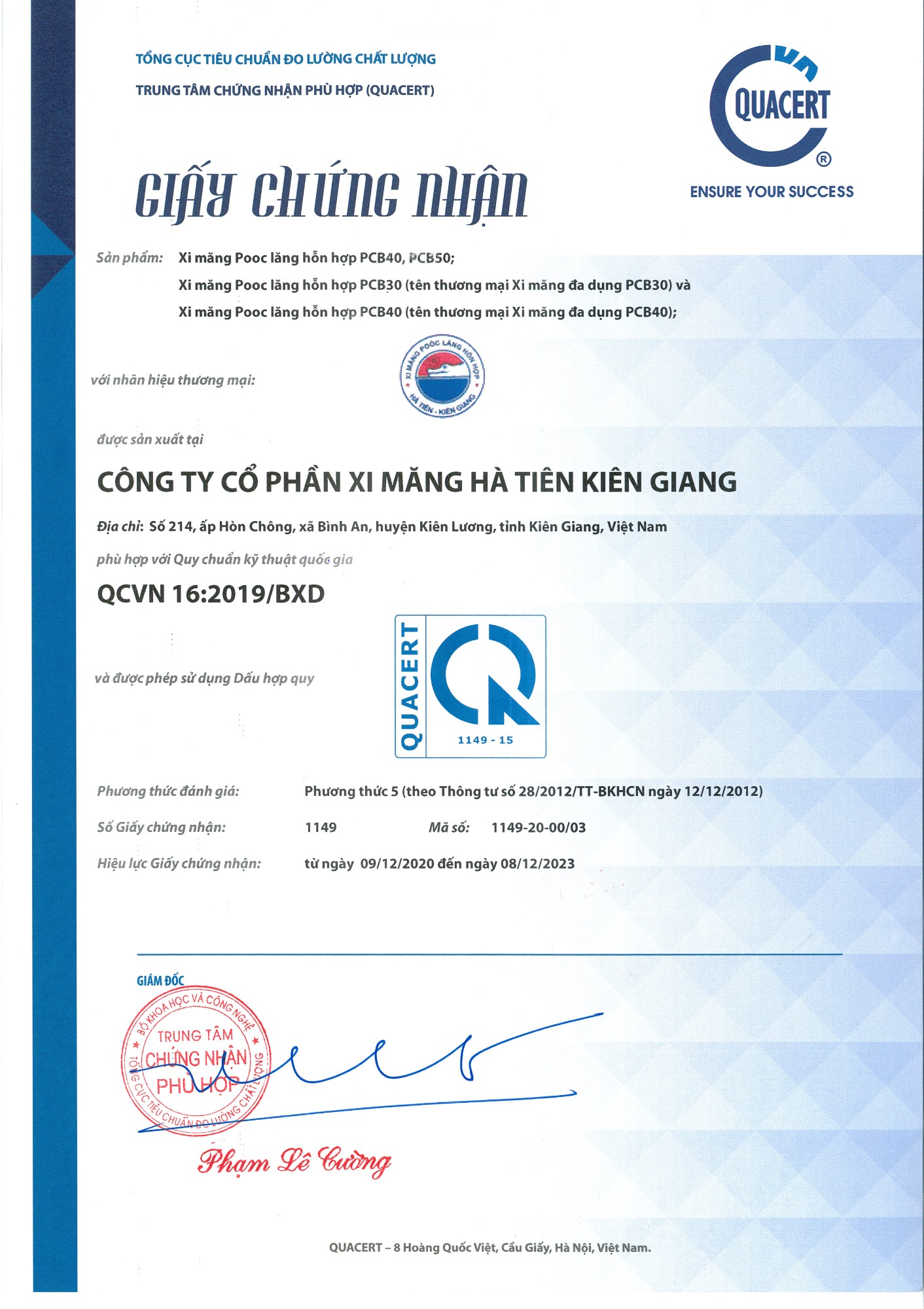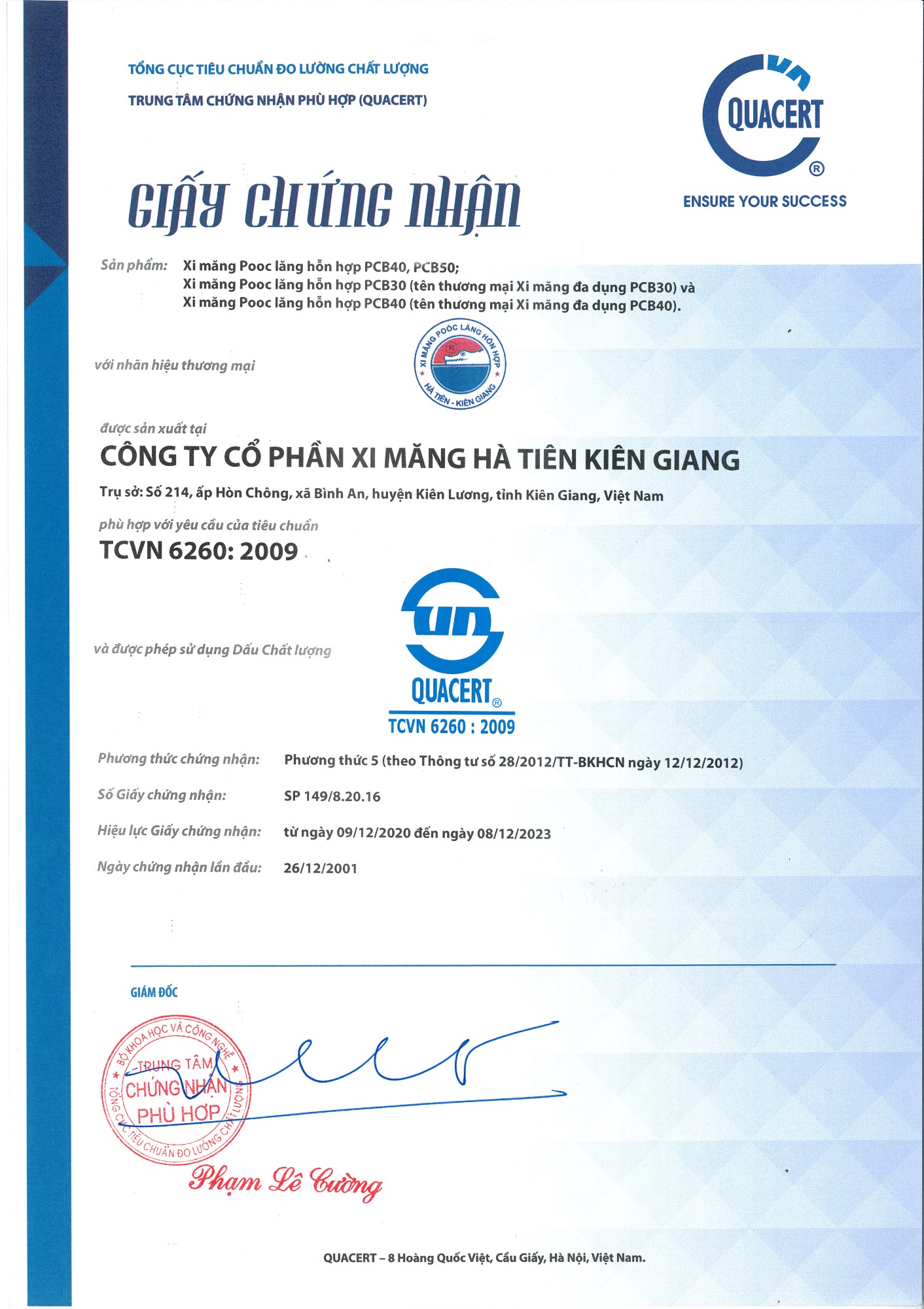 Công ty CP xi măng Hà Tiên Kiên Giang áp dụng Hệ thống quản lý chất lượng Quốc tế ISO 9001:2015 đảm bảo kiểm soát chặt chẽ chất lượng sản phẩm từ khâu nhập nguyên liệu, tạo sản phẩm cho tới khâu xuất sản phẩm; Phòng thí nghiệm được công nhận phù hợp tiêu chuẩn Quốc tế ISO/IEC 17025:2017. Sản phẩm phù hợp tiêu chuẩn Việt Nam TCVN 6260:2009, quy chuẩn Việt Nam QCVN 16:2014/BXD.