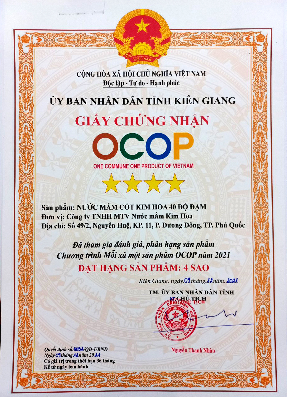 Nước mắm Kim Hoa là nước mắm nguyên chất được làm từ nguồn nguyên liệu các cơm tại vùng biển Phú Quốc, nguyên liệu được tuyển chọn kỹ lưỡng kết hợp với kinh nghiệm sản xuất nước mắm truyền thống từ hàng trăm năm tạo ra một loại nước mắm có mùi thơm đặc trưng; màu cánh gián đậm, trong; vị ngọt, béo của đạm và vị mặn của muối cùng hòa quyện tạo nên hương vị đặc trưng tinh túy của nước mắm Phú Quốc
