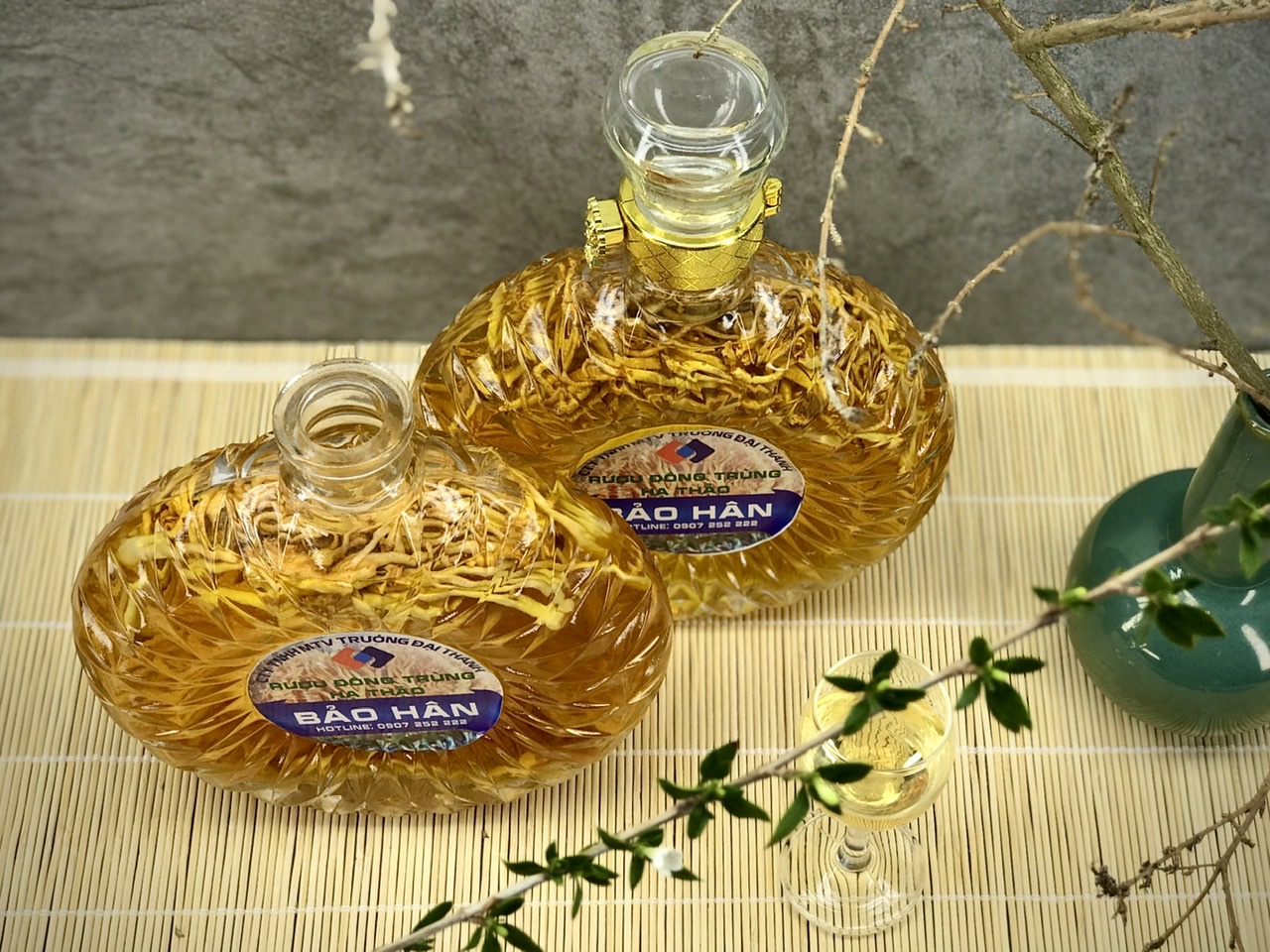Sản phẩm Rượu Đông Trùng Hạ Thảo được sử dụng rượu trắng ngon và ngâm với Đông Trùng Hạ Thảo tươi trong 2 3 tuần mỗi ngày uống 1 2 ly nhỏ giúp bồi bổ sức khoẻ phục hồi thể trạng đặc biệt là người già hoặc người mới ốm dậy