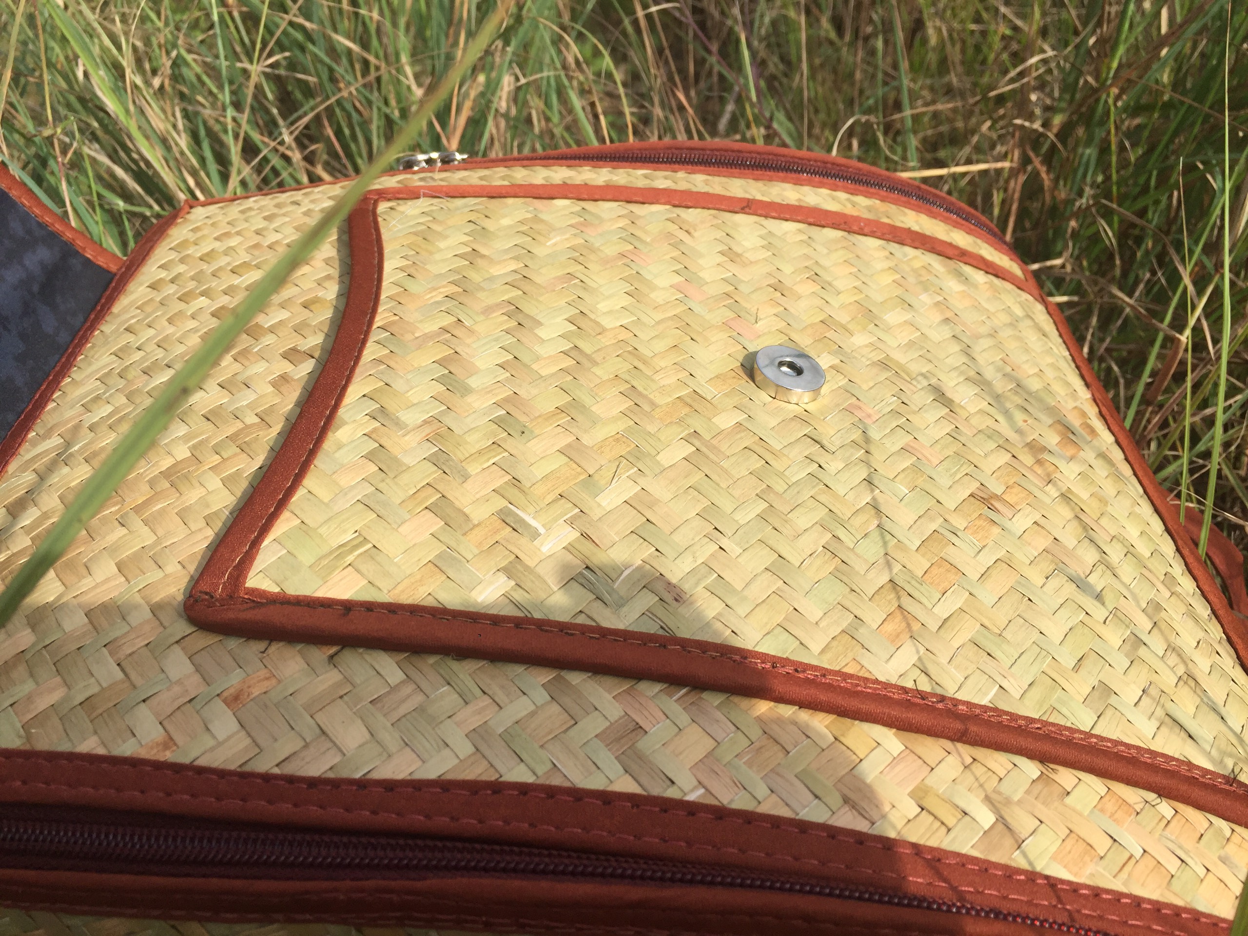 - Lớp bên ngoài được đan chắc chắn bằng cỏ bàng, những đường đan chi tiết tỉ mỉ, được làm thủ công bởi các nghệ nhân là người dân địa phương. Vì lớp ngoài là lớp cỏ khô nên nó rắn chắc, đàn hồi tốt, được thiết kế để làm bộ khung cho giỏ. Đường chỉ may ngay ngắn, ngăn nắp, đồng đều. Màu chỉ được lựa chọn, hài hoà với tổng thể màu của giỏ, không bị chõi màu. Cho nên, lớp vỏ ngoài của balo được ví như người phụ nữ Việt Nam rắn rỏi, bất khuất.