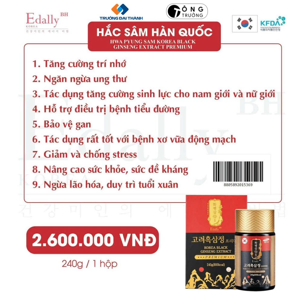 Hắc sâm Edally từ nhân sâm Hàn Quốc đã qua chế biến có nhiều công dụng hiệu quả trong việc chữa bệnh, bồi bổ và nâng cao sức khỏe, làm đẹp da, cải thiện sinh lý.