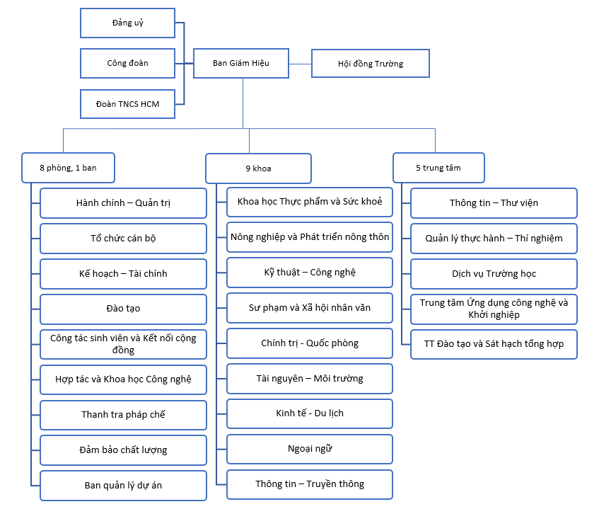 Trường hiện có khoảng 300 viên chức và người lao động, trong đó có gần 200 giảng viên có trình độ sau đại học, tất cả đều đạt chuẩn giảng viên đại học trở lên. Về bộ máy tổ chức, ngoài Đảng ủy, Hội đồng trường, Công đoàn, Đoàn Thanh niên, Hội sinh viên và Ban Giám hiệu, Trường có 8 phòng, 01 ban, 9 khoa và 05 trung tâm.