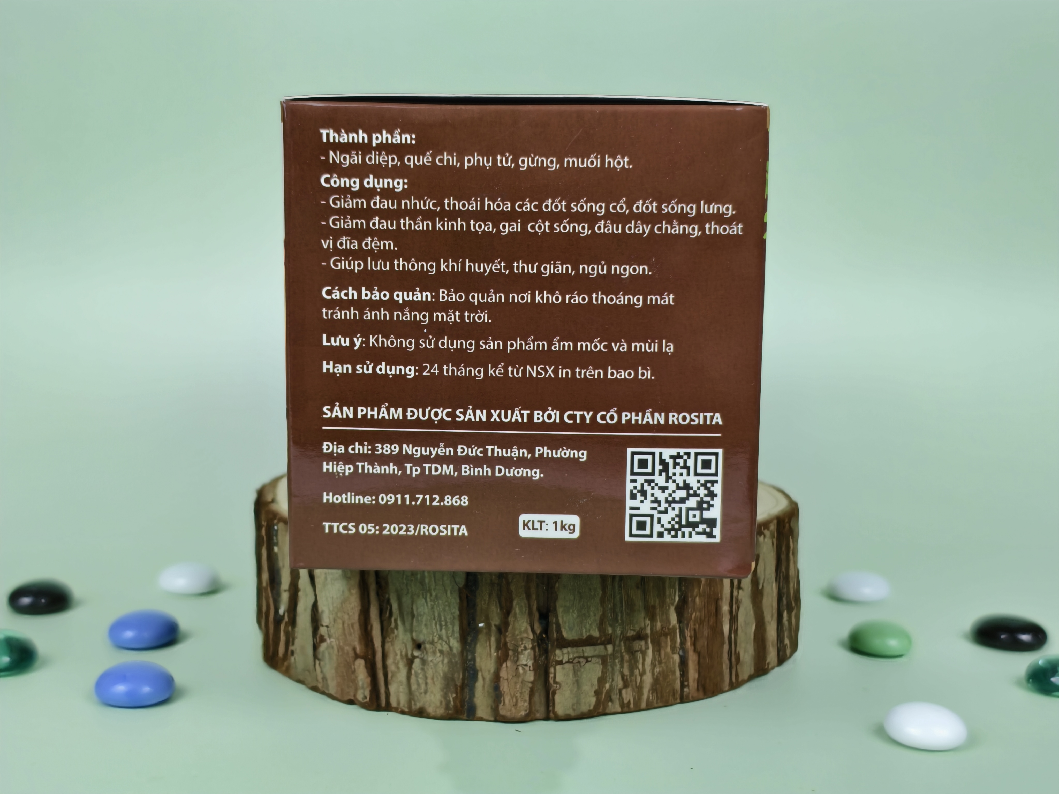 - Thành phần: Muối biển sạch tinh khiết, gừng, ngải cứu, quế, lá lốt và các thảo mộc quý khác hỗ trợ giảm đau và thư giãn cơ thể