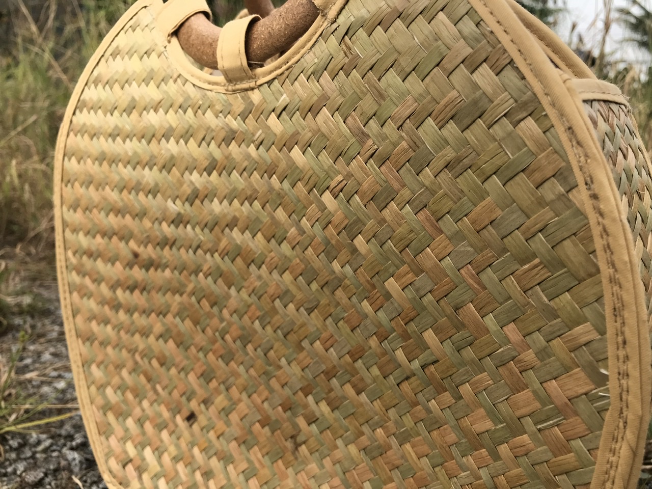 - Lớp bên ngoài được đan chắc chắn bằng cỏ bàng, những đường đan chi tiết tỉ mỉ, được làm thủ công bởi các nghệ nhân là người dân địa phương. Vì lớp ngoài là lớp cỏ khô nên nó rắn chắc, đàn hồi tốt, được thiết kế để làm bộ khung cho giỏ. Đường chỉ may ngay ngắn, ngăn nắp, đồng đều. Màu chỉ được lựa chọn, hài hoà với tổng thể màu của giỏ, không bị chõi màu. Cho nên, lớp vỏ ngoài của giỏ được ví như người phụ nữ Việt Nam rắn rỏi.