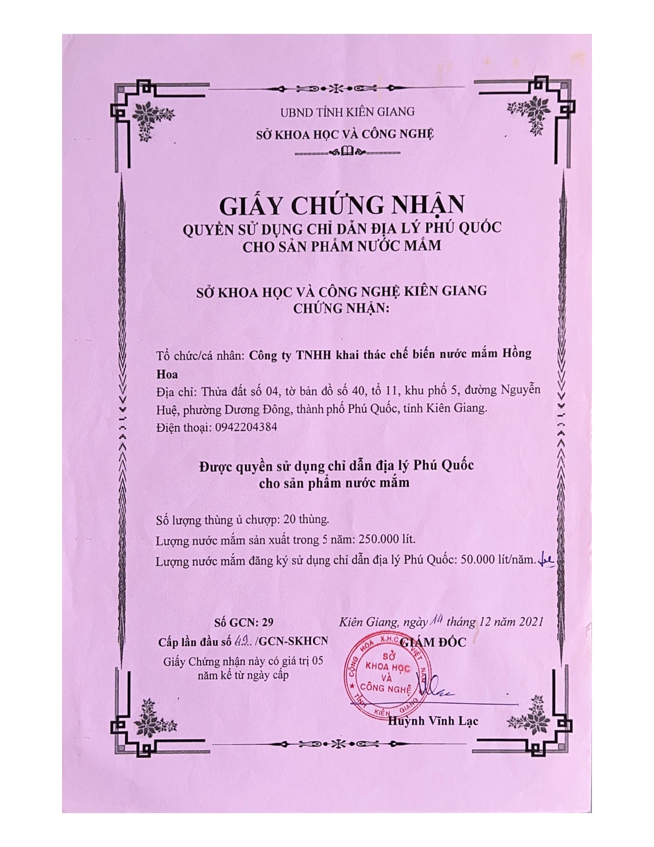 Sản phẩm nước mắm chỉ dẫn địa ý Phú Quốc được bảo hộ tại Liên minh châu Âu và Việt Nam khi được sản xuất đúng quy trình kỹ thuật, đóng chai tại Phú Quốc, dán nhãn theo quy định và dán tem chỉ dẫn địa lý do Bạn kiểm soát nước mắm Phú Quốc cấp. Mã số tem: PQ… là mã số do Bạn kiểm soát cấp nhằm truy xuất nguồn gốc của sản phẩm.
