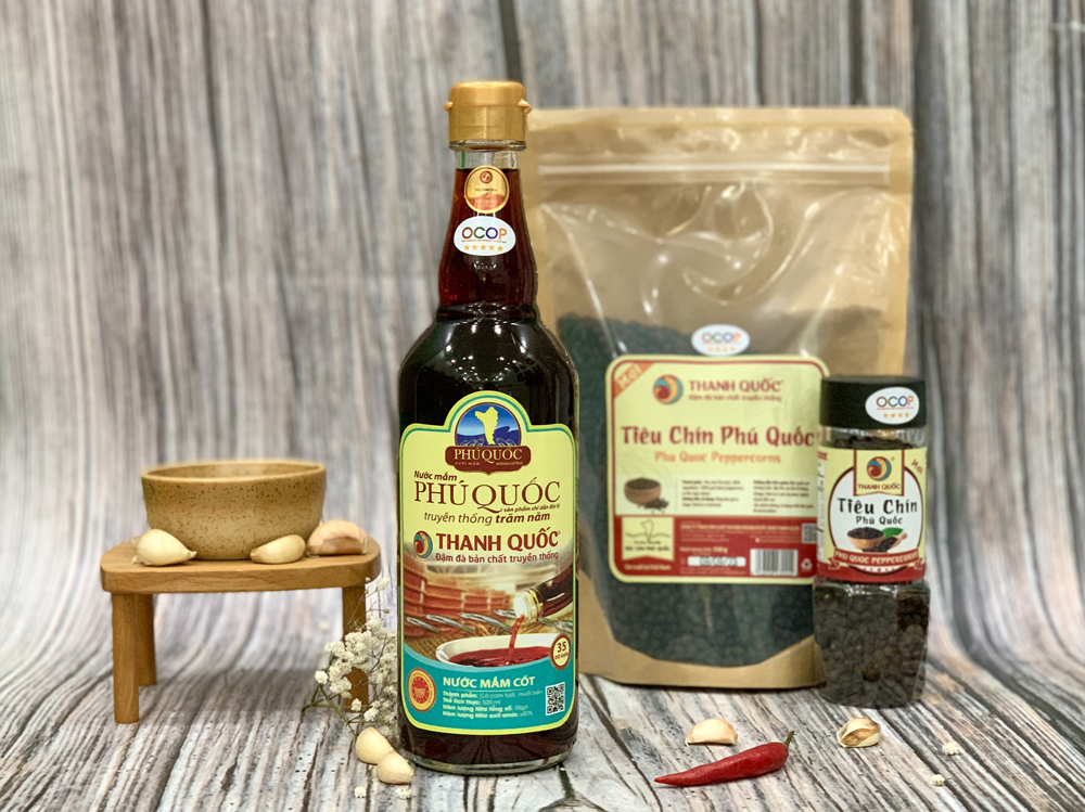 Nước Mắm Chỉ Dẫn Địa Lý Phú Quốc - Thanh Quốc 35 Độ Đạm – từ cá cơm tươi vùng biển Phú Quốc và muối Bà Rịa – Vũng Tàu, ủ chượp thùng gỗ 12–15 tháng theo quy trình truyền thống.