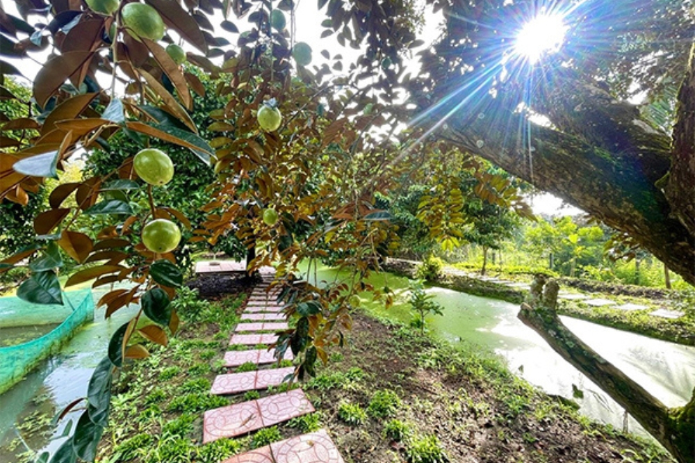 Vườn cây trái trĩu quả tươi mát, tiếng chim hót trên cây, cá dưới ao bèo xanh mướt tung tăng bơi lội tất cả như bỏ lại cái bụi bặm, hối hả ồn ào của phố thị phía sau. Bạn có thể vươn vai, hít một hơi thật dài để cảm nhận luồng không khí trong lành ùa vào cơ thể mình. Con người như hoà mình vào thiên nhiên, bình yên và nhẹ nhàng đến lạ.