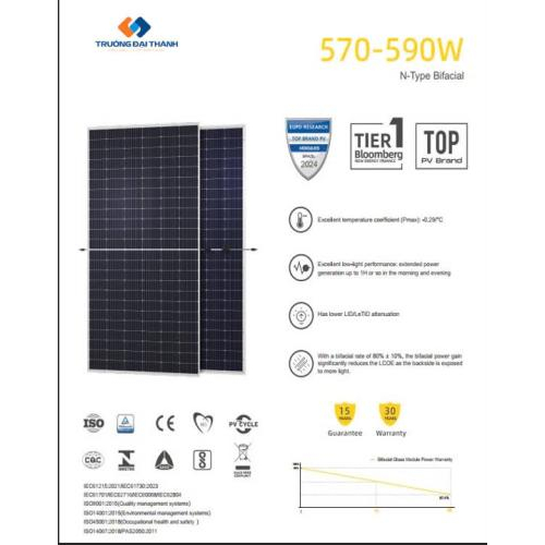 Công suất mạnh mẽ 590Wp: Tối ưu hóa sản lượng điện cho mỗi mét vuông lắp đặt.