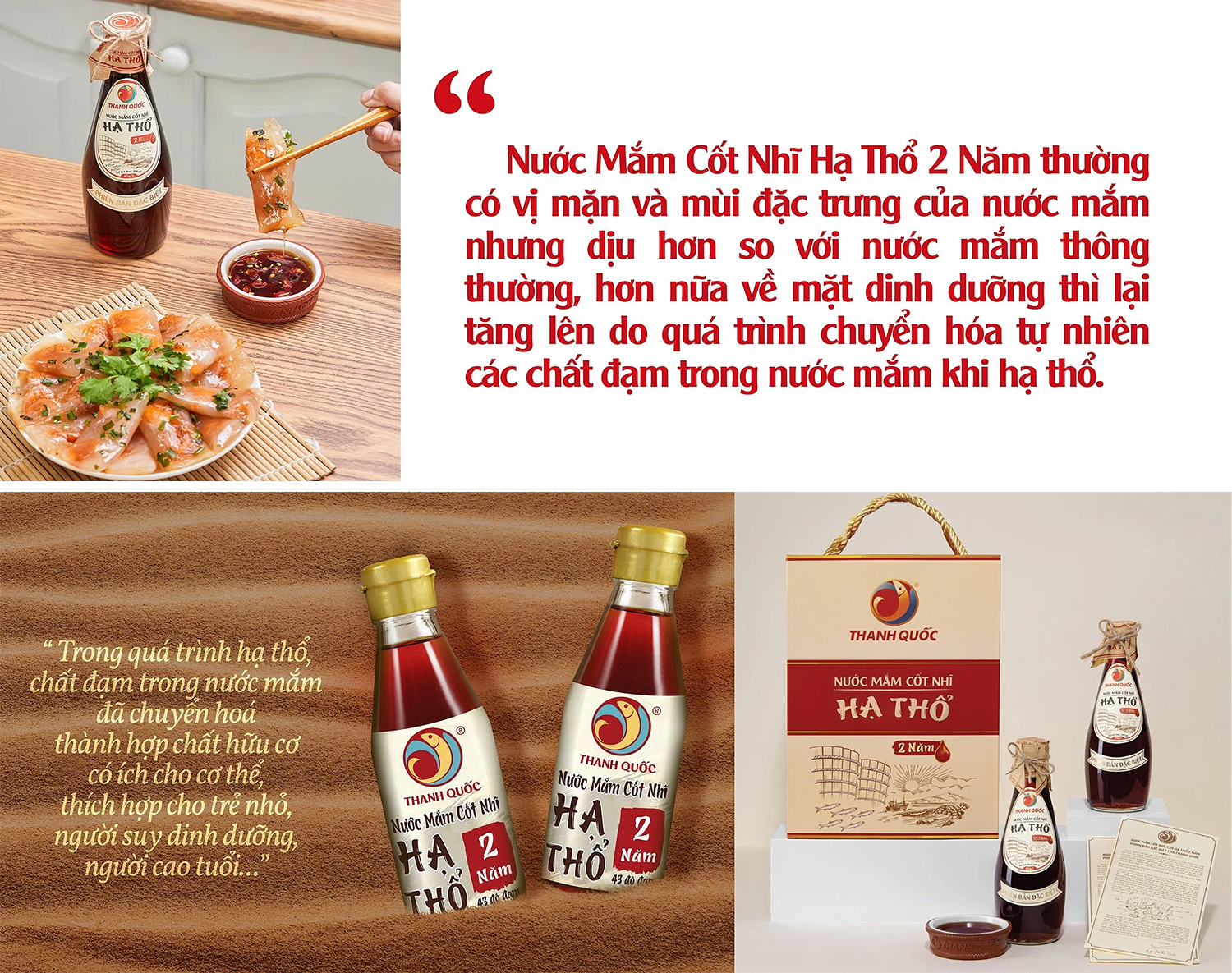 Nước Mắm Cốt Nhĩ Hạ Thổ 2 Năm là một loại nước mắm vô cùng đặc biệt của Thanh Quốc, chiếm tỷ trọng rất nhỏ trong cơ cấu sản xuất của nước mắm Thanh Quốc nói riêng và nước mắm Phú Quốc nói chung do chi phí sản xuất lớn, giá thành cao. Nhưng Nước mắm Cốt Nhĩ Hạ Thổ 2 Năm lại có sức hút rất lớn đối với người tiêu dùng, nhất là các thực khách có gu ẩm thực tinh tế, quan tâm đến sức khoẻ của bản thân, gia đình và người thân.