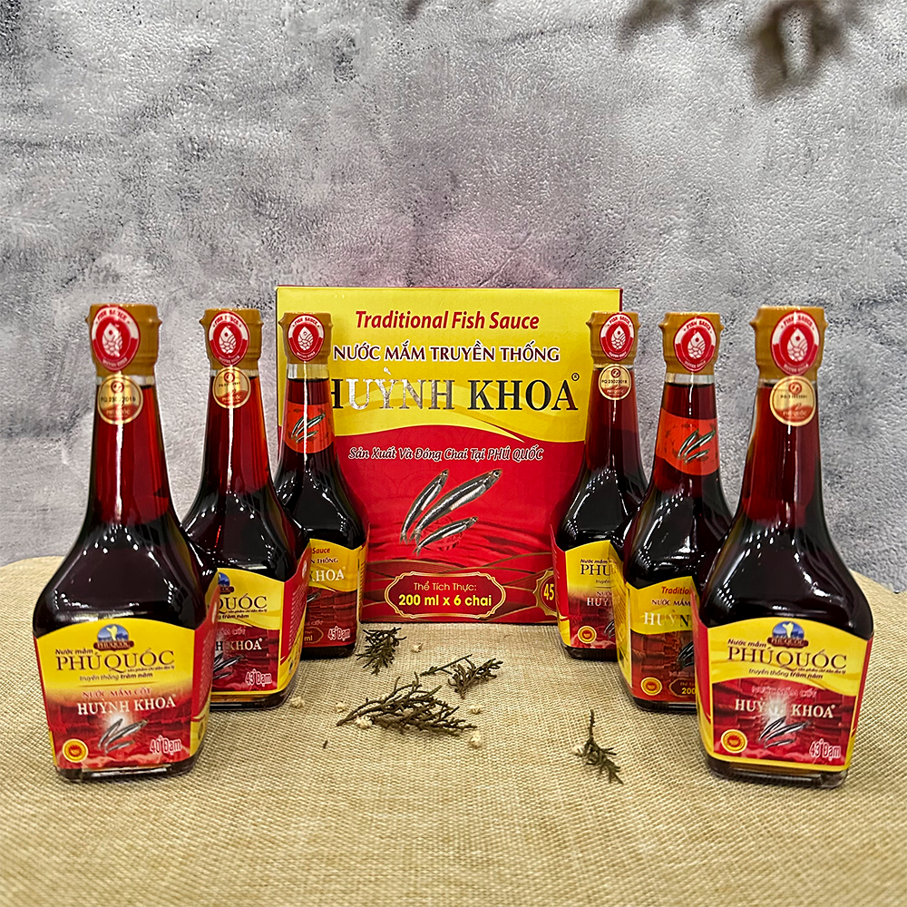 Nước Mắm Cốt Nhĩ Truyền Thống CDĐL Phú Quốc Huỳnh Khoa 40 độ đạm (Nguyên Chất) - Chai 200 ml - Hộp 6 Chai