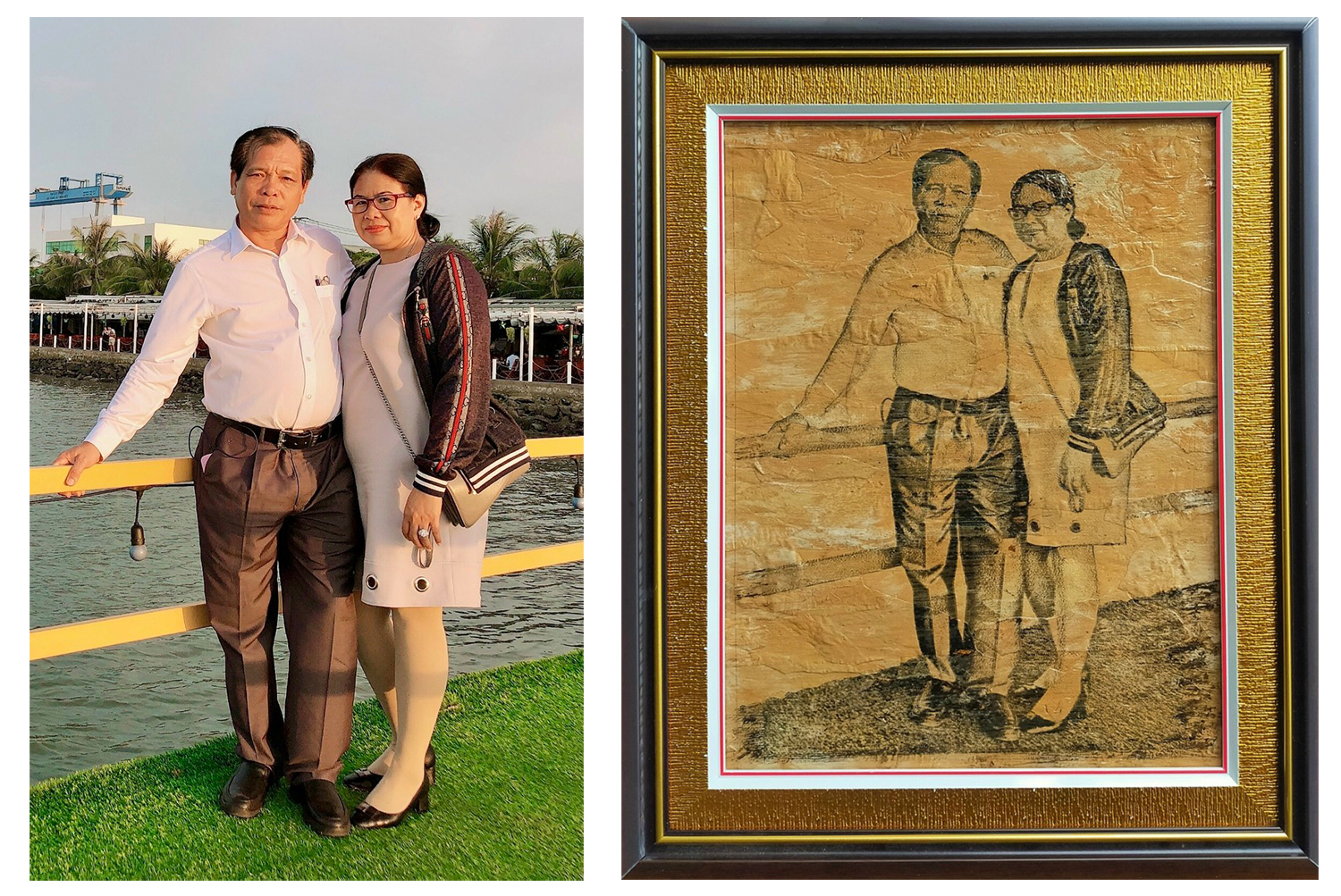 Điểm đặc biệt hơn là những sáng tác không phải bằng cọ hay bút thông thường mà bằng cách đốt vỏ tràm bằng “cọ lửa” - một loại mỏ hàn chì dùng trong sửa đồ điện tử. Người nghệ sĩ dùng “cọ lửa” chấm từng nét đậm nhạt, tạo hình khối khuôn mặt và các điểm nhấn, khéo léo và tinh tế vô cùng.