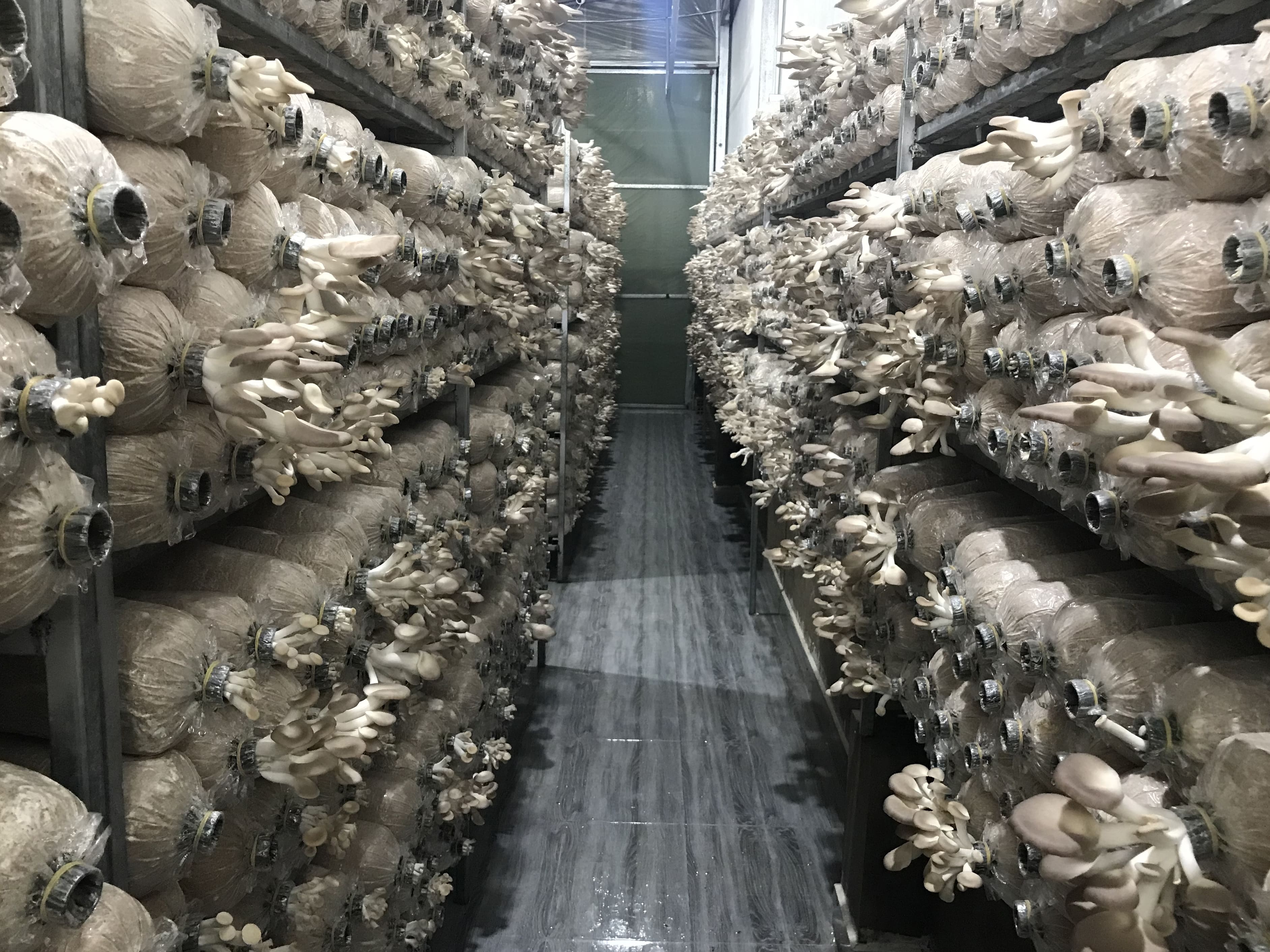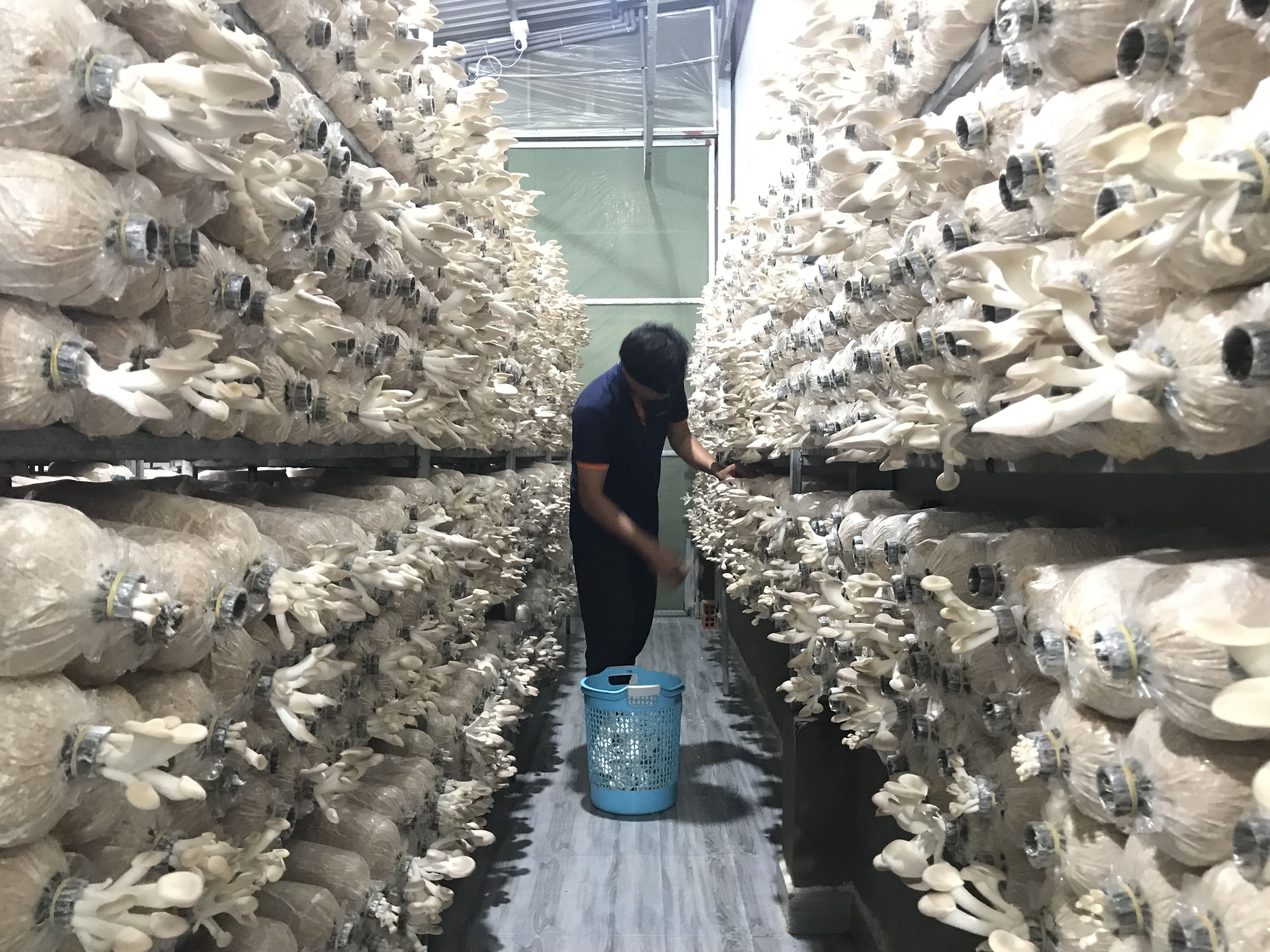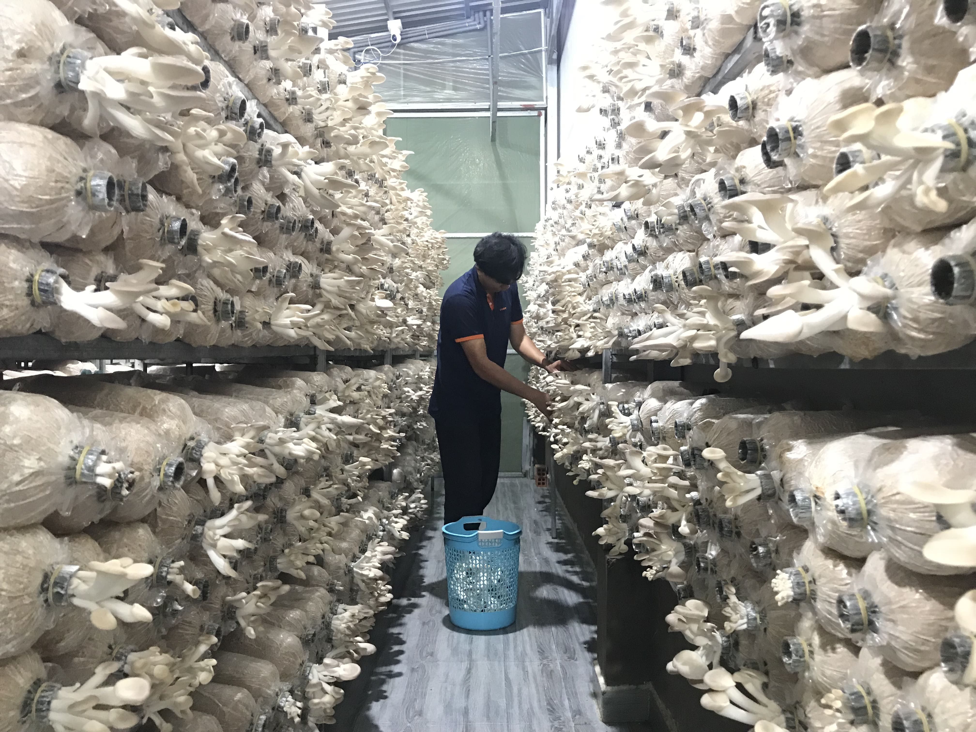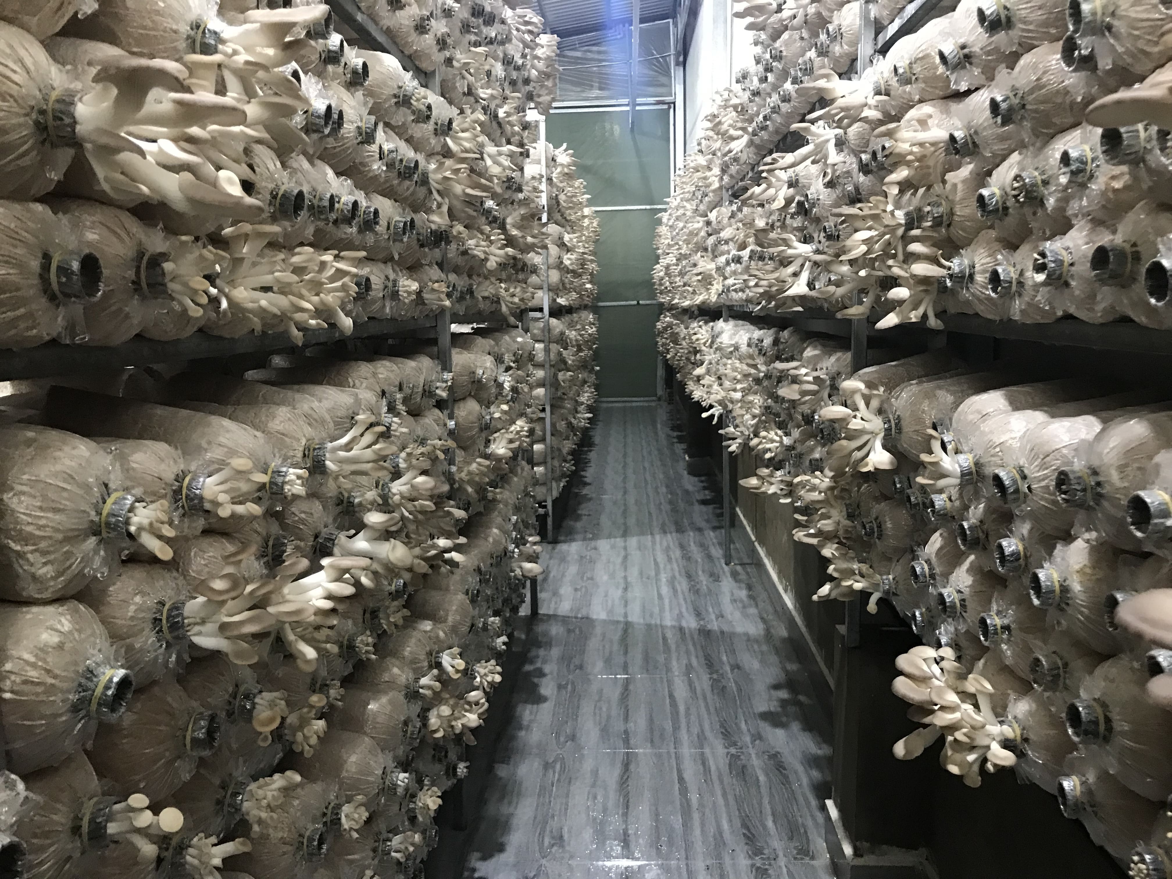 Với hệ thống trang trại nuôi trồng nấm hiện đại, đảm bảo thoáng mát, nhưng vẫn hạn chế được gió lùa và ánh nắng trực tiếp cho nấm. Kệ phôi được bố trí hợp lí để nấm có không gian thở và người chăm sóc, thu hái, tưới tiêu dễ dàng, đảm bảo năng suất cao, thu hoạch nhanh.