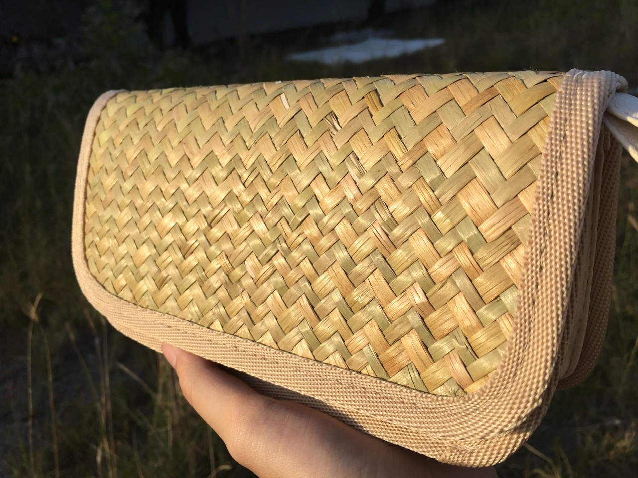- Lớp ngoài được đan bằng cỏ bàng, với các đường đan tinh tế, tạo nên bộ khung của ví. Lớp viền bằng vải bên ngoài có thể tạo nên cảm giác mềm mại để người dùng để cầm nắm