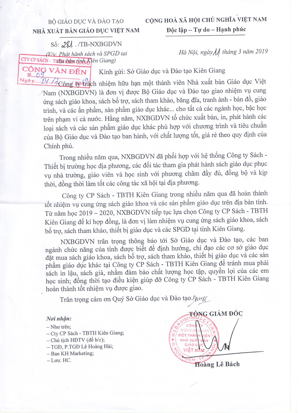Chủ tịch UBND tỉnh Kiên Giang đã ra quyết định số 371/QĐ-UB ngày 30-8-1982. Thành lập công ty Sách Thiết Bị Trường Học trực thuộc Công Ty Giáo Dục (nay là sở Giáo dục – Đào tạo Kiên Giang)