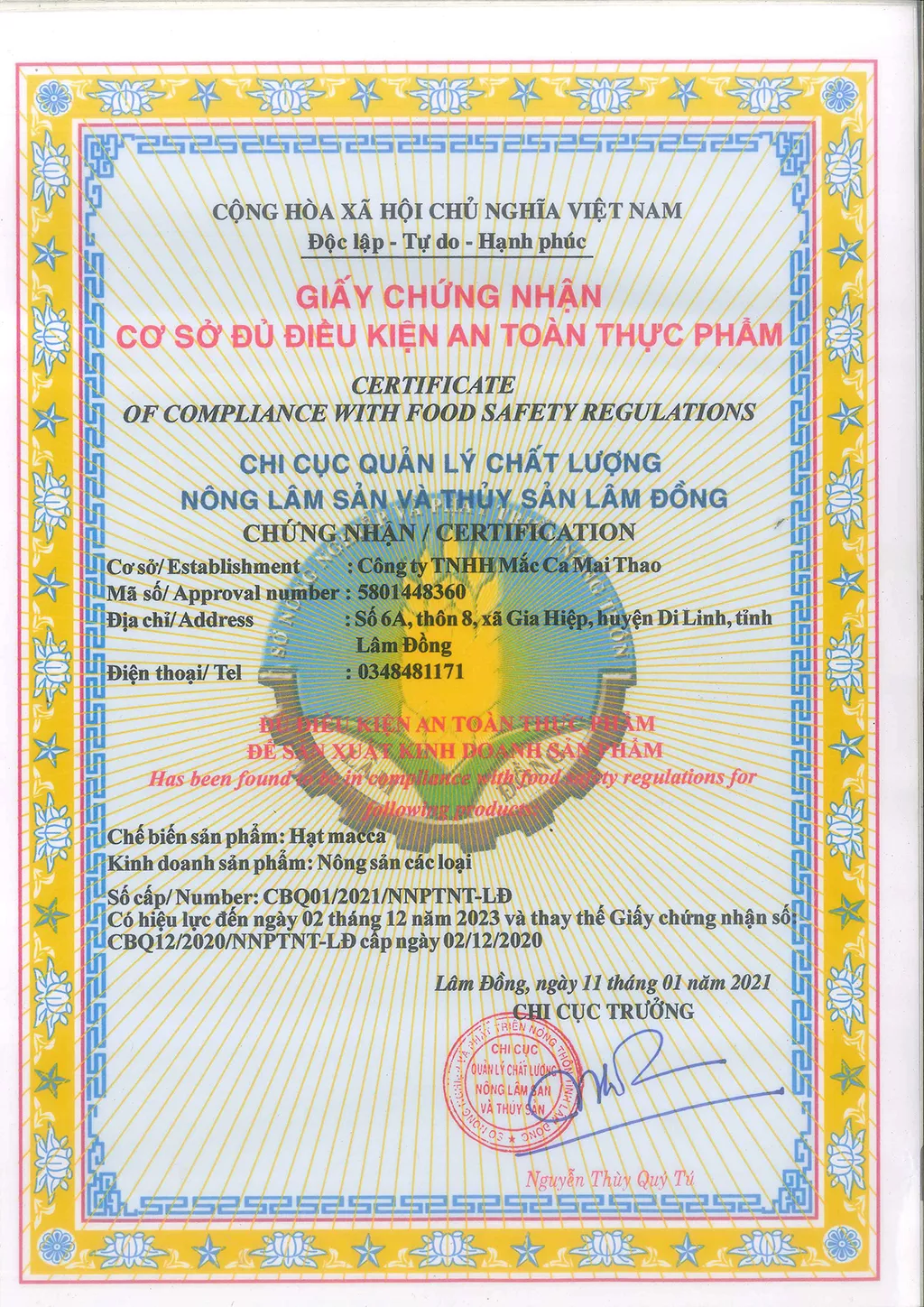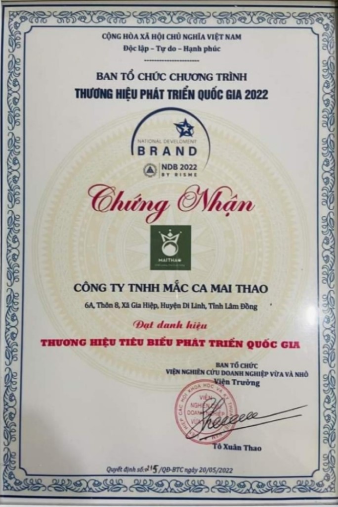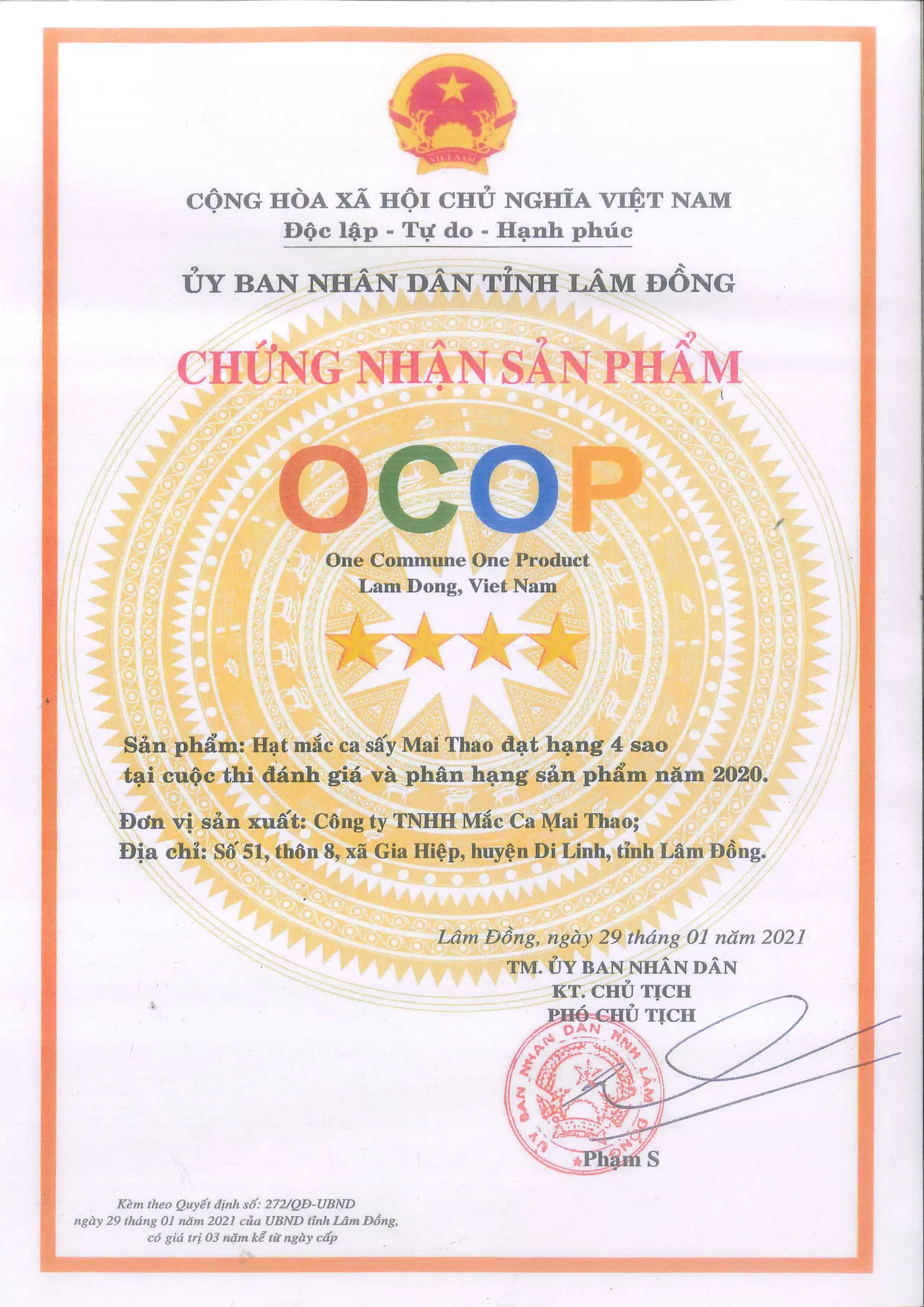 Maccca Mai Thao đã được chứng nhận đạt hạng 4 sao của OCOP tại cuộc thi đánh giá và phân hạng sản phẩm năm 2020, và giấy khen của Sở Công Thương tỉnh Lâm Đồng. Sản phẩm của chúng tôi đều được chọn lựa kỹ lưỡng và có sự sàng lọc từ nguồn nhiên liệu đầu vào từ các nông hộ khu vực Tây Nguyên.
