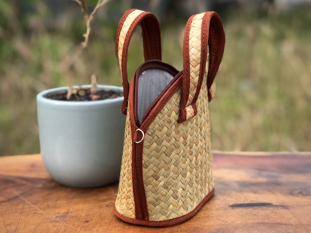 - Lớp bên ngoài được đan chắc chắn bằng cỏ bàng, những đường đan chi tiết tỉ mỉ, được làm thủ công bởi các nghệ nhân là người dân địa phương. Vì lớp ngoài là lớp cỏ khô nên nó rắn chắc, đàn hồi tốt, được thiết kế để làm bộ khung cho giỏ. Đường chỉ may ngay ngắn, ngăn nắp, đồng đều. Màu chỉ được lựa chọn, hài hoà với tổng thể màu của giỏ, không bị chõi màu. Cho nên, lớp vỏ ngoài của giỏ được ví như người phụ nữ Việt Nam rắn rỏi.