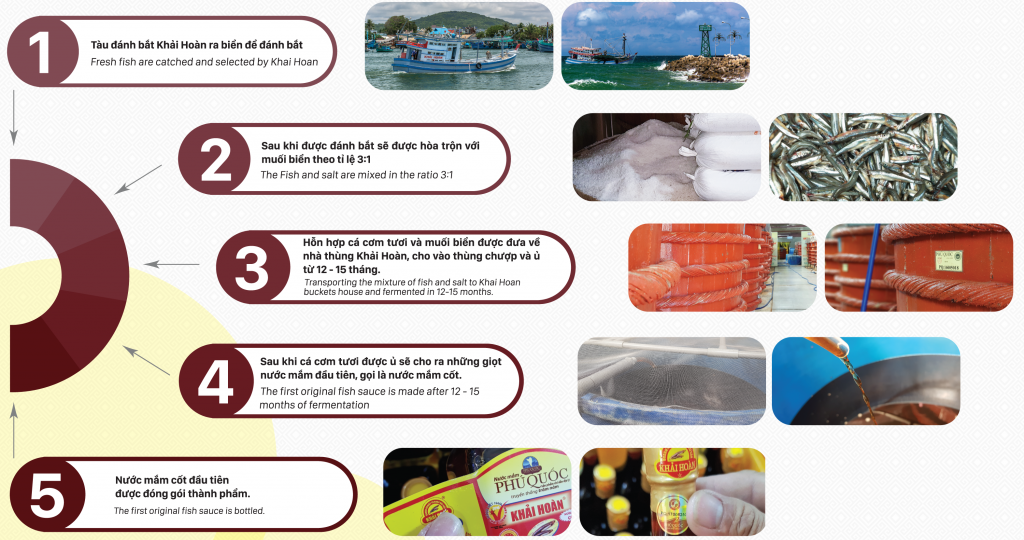 Luôn xem “Truyền thống là danh dự”, Khải Hoàn chú trọng duy trì sản xuất theo phương pháp truyền thống: “Cá biển tươi ướp với muối biển theo tỉ lệ 1:3 được lên men hoàn toàn tự nhiên trong thùng gỗ bời lời với tuổi thọ lên đến hàng chục năm mà không dùng bất kỳ chất xúc tác nào trong thời gian ủ chượp từ 10-12 tháng, sau đó cho ra thành thẩm đóng chai mang thương hiệu nước mắm truyền thống Phú Quốc – Khải Hoàn”. Hiện nay, Khải Hoàn đã đạt được sản lượng 5-6 triệu lít nước mắm mỗi năm và sản lượng này tiếp tục tăng lên hàng năm.