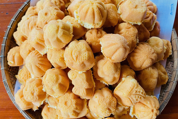 Hoặc du khách cũng có thể trải nghiệm làm bánh bông lan nướng do cô Sáu hướng dẫn, với các nguyên liệu như bột mì, đường, trứng vv... được đánh đều lên để bột mịn và cho vào khuôn bánh canh lửa than chờ từ 7 - 8 phút khi bánh có mùi thơm phức là bánh đã chín, cẩn thận ghim từng cái bánh đã chín ra.