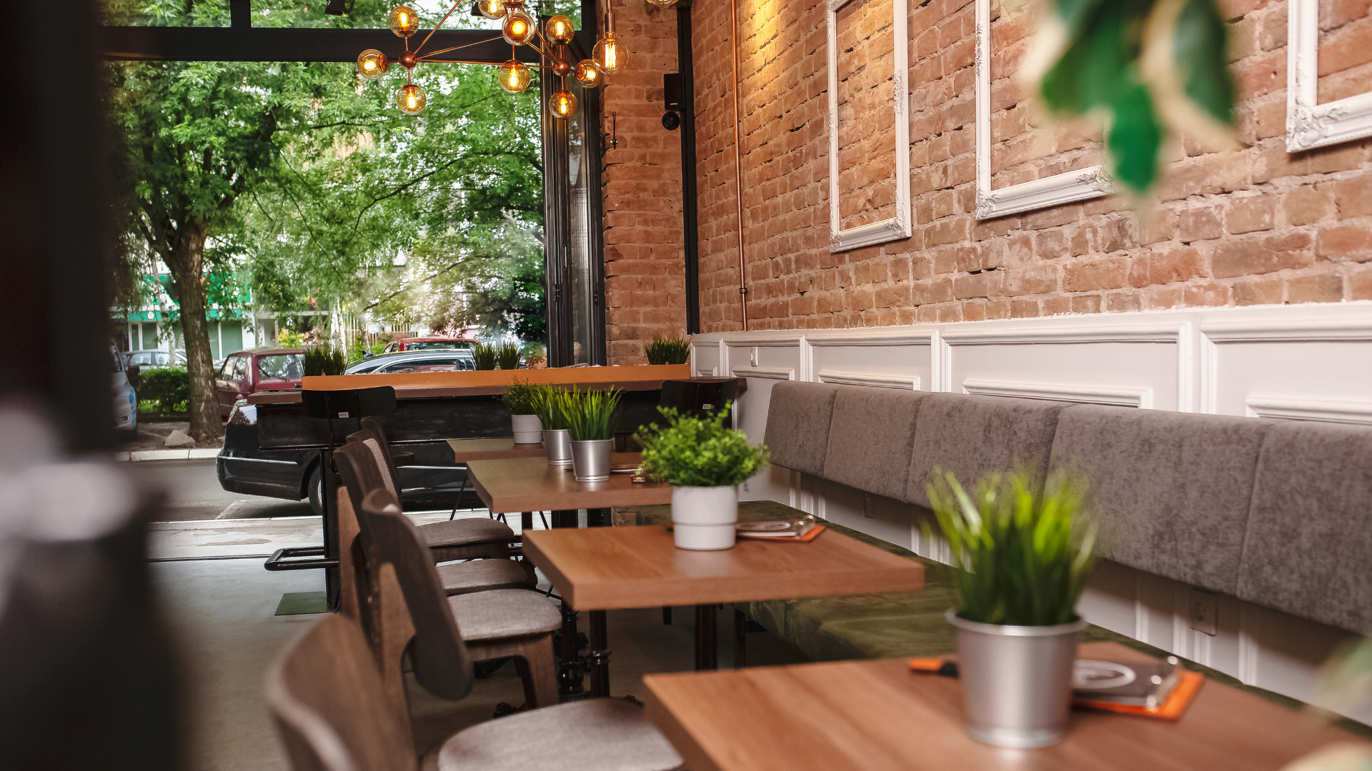 - Bàn ghế gỗ tự nhiên, tranh vẽ tường, và đèn lồng tạo nên không gian ấm cúng, thư thái.