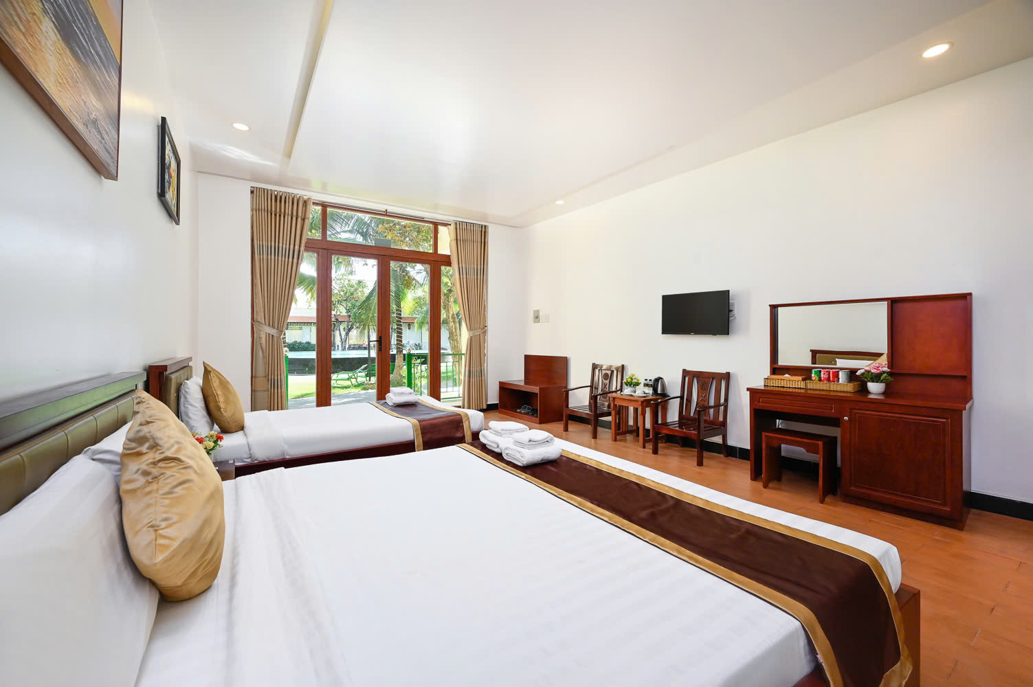 Deluxe Triple Bungalow thoáng mát với các tiện nghi hiện đại nhìn ra hồ bơi và hàng dừa xanh mát với vị trí gần nhà hàng.