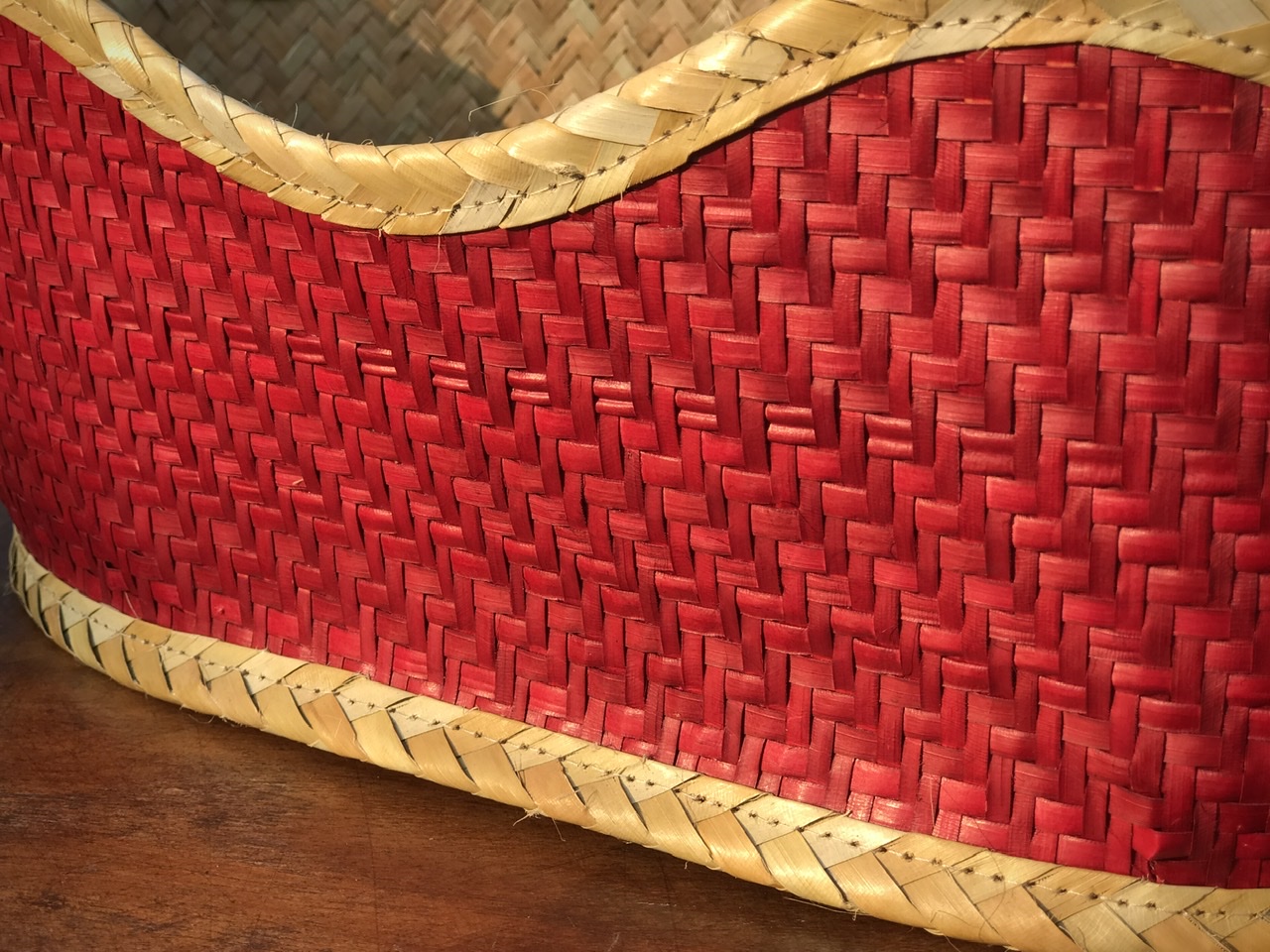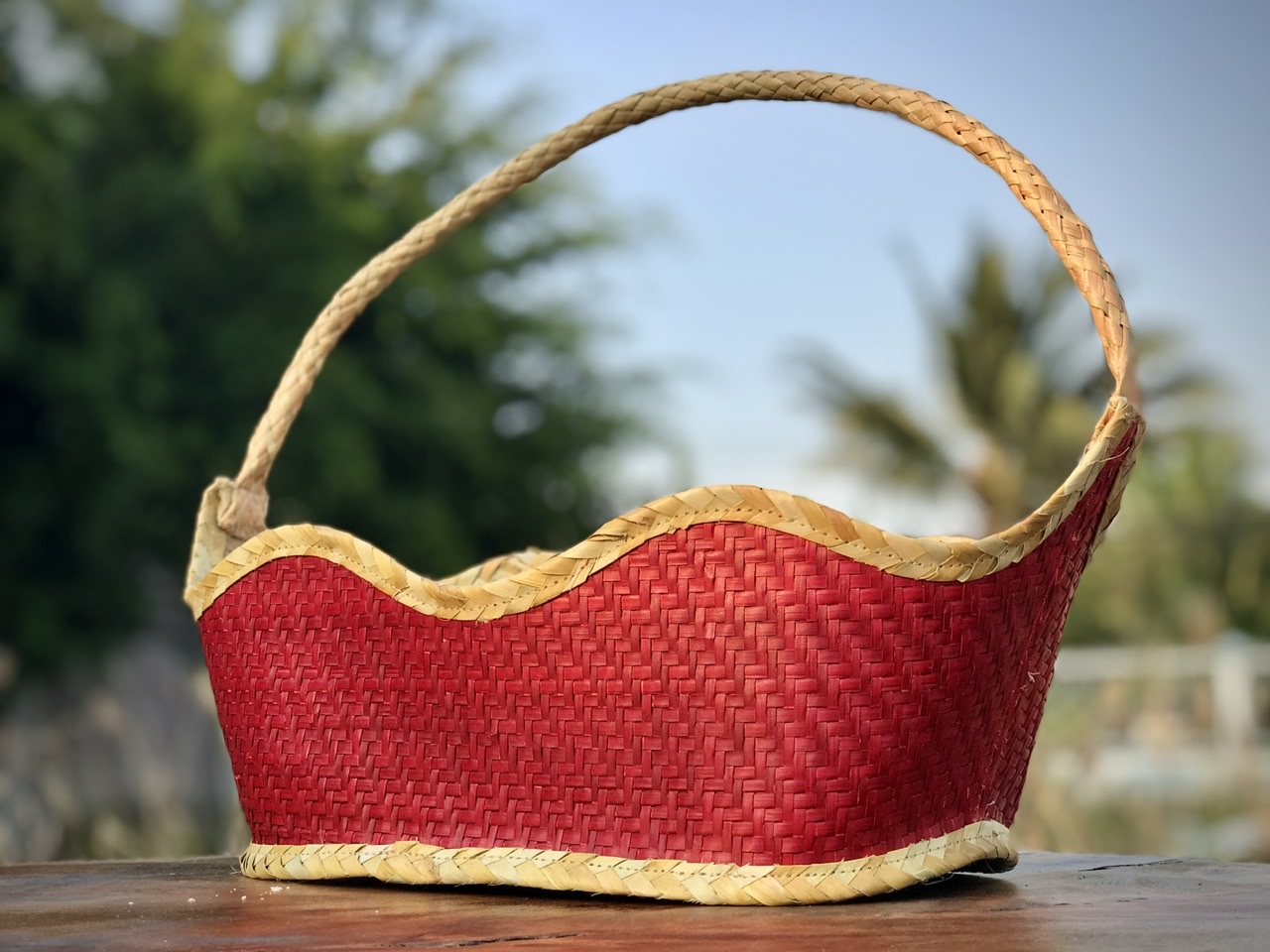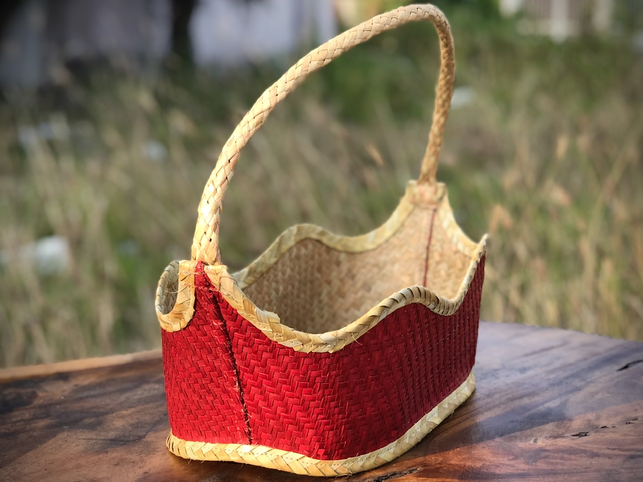 Thêm vào đó, thành của giỏ được thiết kế uốn lượn, làm toát lên vẻ mềm mại, uyển chuyển. Cùng với sự kết hợp màu sắc hài hòa giữa màu sắc truyền thống của cỏ bàng cùng màu đỏ bắt mắt tạo thêm sự hiện đại xen kẻ truyền thống cho giỏ.