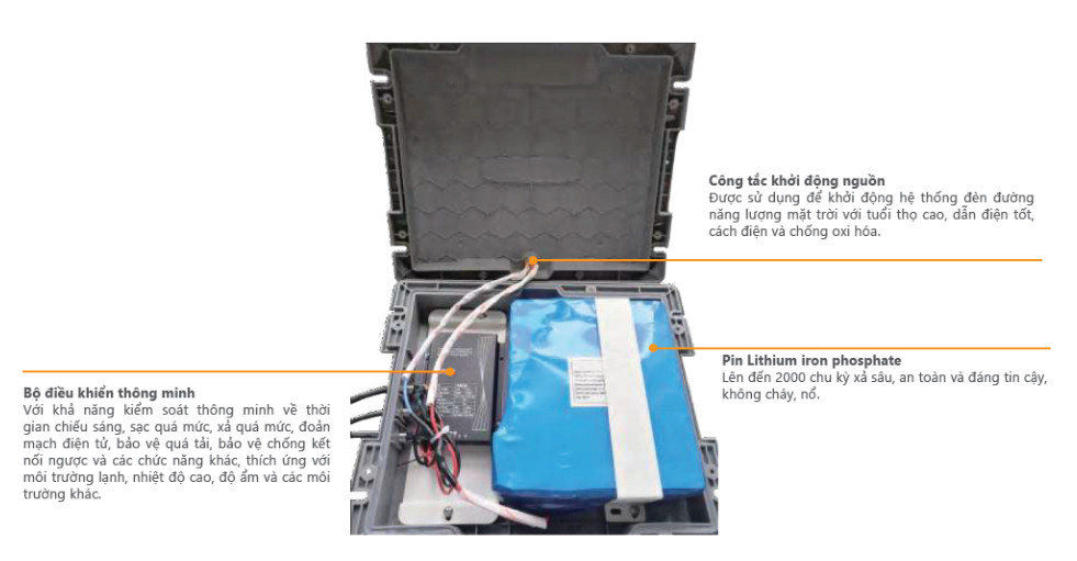- Bộ điều khiển thông minh: chức năng giám sát hoạt động của đèn, kéo dài tuổi thọ của đèn. Giúp đèn tự sáng khi trời tối, tắt khi trời sáng