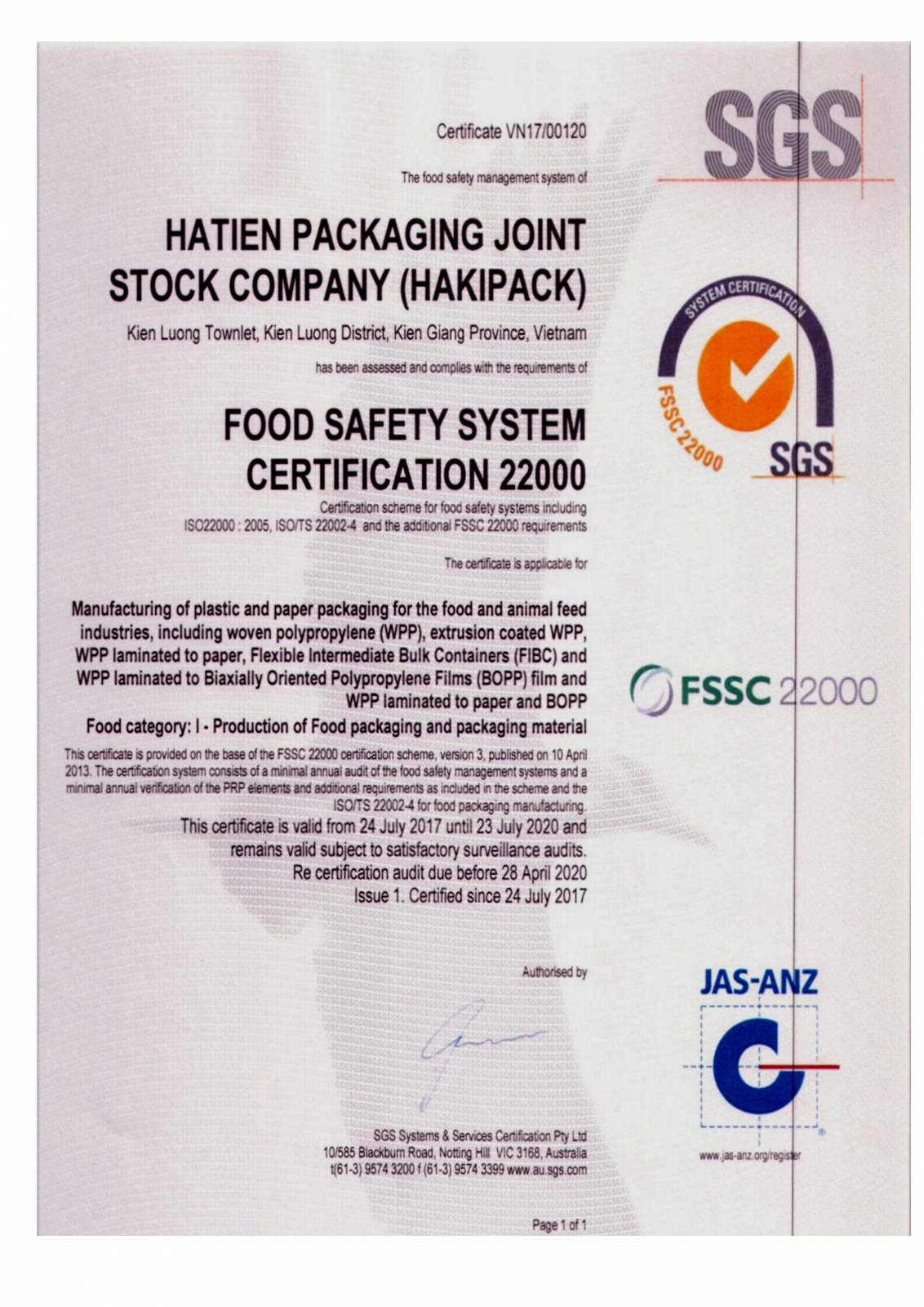 Luôn vấp phải sự cạnh tranh hết sức gay gắt từ các nhà sản xuất cùng loại sản phẩm trong và ngoài nước, sản phẩm cuả Hakipack không những đứng vững mà còn được khách hàng ưa chuộng, hợp tác lâu dài. Thành công này bắt nguồn từ chính sách chất lượng, tôn trọng khách hàng, luôn thực hiện quản lý chất lượng sản phẩm theo ISO 9001 và hệ thống quản lý môi trường ISO 14001được tổ chức TUV Rhemland chứng nhận. Sản phẩm cuả Hakipack đạt tiêu chuẩn Châu Âu, được kiểm tra bởi phòng thí nghiệm Laboratoire national de métrologie et d’esssais cuả Pháp và phòng thí nghiệm Bureau veritas cuả Tây Ban Nha.
